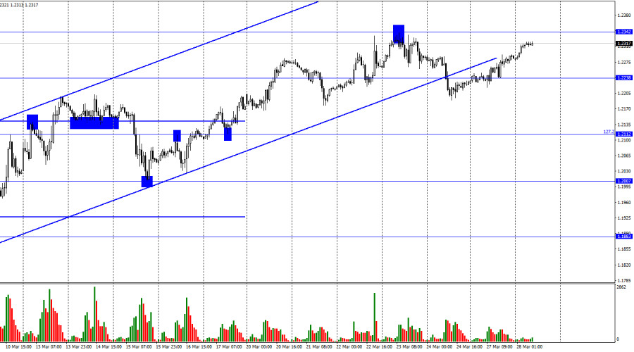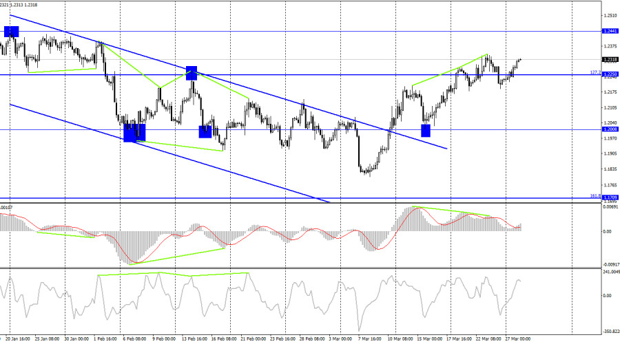 GBP/USD. 28 марта. Эндрю Бейли ничего интересного не сообщилИнстаФорекс - Instaforex, 2 года назад Добрый день, уважаемые трейдеры! На часовом графике пара GBP/USD в понедельник продолжала процесс роста, а сегодня – подобралась вплотную к уровню 1,2342. Отбой котировок от этого уровня вновь сработает в пользу американской валюты и некоторого падения в направлении уровня 1,2238. Закрытие курса пары над 1,2342 повысит вероятность дальнейшего роста в направлении следующего уровня 1,2432. Закрытие пары под восходящим трендовым коридором все еще позволяет трейдерам ожидать падение. В понедельник должно было состояться выступление губернатора Банка Англии Эндрю Бейли. Однако на данный момент никакой информации по этому поводу нет, из чего можно сделать вывод, что ничего важного Бейли не сказал. Сегодня состоится еще одно его выступление, будем ждать важной информации. Британец вновь растет, и достаточно сложно объяснить почему он это делает при пустом информационном фоне, а также после нескольких недель роста. Возможно, трейдеры просто не понимают, чего ожидать от британского регулятора в ближайшее время и закладывают в цены наиболее «ястребиный» сценарий. Также следует помнить, что ФРС с высокой долей вероятности повысит ставку еще 1 раз. Об этом уже заявил Джеймс Буллард из ФРС. Так как инфляция в США падает достаточно быстро, перед американским регулятором уже не стоит задачи ужесточать как можно быстрее. Но и Банк Англии вряд ли будет продолжать ужесточение ДКП долгое время. Таким образом, я считаю, что сейчас многие факторы говорят о падении британца. Но даже закрытие под трендовым коридором пока не является причиной для медведей вступать в рынок. Ситуация неоднозначная и запутанная. Все наиболее важные события запланированы на четверг и пятницу. Первые три дня недели трейдеры могли бы использовать для отката, но они пока абсолютно не стремятся к этому. На 4-часовом графике пара выполнила разворот в пользу валюты Великобритании и возобновили процесс роста в направлении уровня 1,2441. В ближайшее время может назревать новая «медвежья» дивергенция у индикатора MACD, которая позволит рассчитывать на новый разворот в пользу доллара и некоторое падение. Однако закрытие над нисходящим трендовым коридором все еще сохраняет высокие шансы на продолжение роста. Отчет Commitments of Traders (COT): Настроение категории трейдеров «Non-commercial» за последнюю отчетную неделю практически не изменилось. Количество Long-контрактов на руках спекулянтов сократилось на 3682 единицы, а количество Short – на 498. Общее настроение крупных игроков остается прежним – «медвежьим», а количество Short-контрактов по-прежнему превышает количество Long-контрактов. За последние несколько месяцев ситуация перманентно менялась в сторону британца, но сейчас разница между количеством Long и Short на руках спекулянтов все еще остается существенной. Таким образом, перспективы фунта улучшаются, но сам британец в последние несколько месяцев и не растет, и не падает. На 4-часовом графике состоялся выход за пределы нисходящего коридора, и этот момент может поддерживать фунт. Однако замечу, что сейчас многие факторы противоречат друг другу, а информационный фон оказывает не большую поддержку фунту. Календарь новостей для США и Великобритании: Великобритания – Выступление главы Банка Англии Бейли (08-45 UTC). Во вторник 