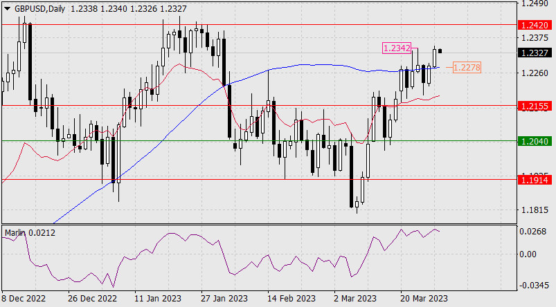 Прогноз по GBP/USD на 29 марта 2023 годаИнстаФорекс - Instaforex, 2 года назад Воспользовавшись слабостью американского доллара, фунт стерлингов вчера подрос на 54 пункта, закрепившись над линией Крузенштерна и открыв цель 1.2420. Но есть нюанс – фунт приостановился на промежуточном сопротивлении 1.2342, заданное пиком 23 марта, и если осциллятор Марлин усилит разворотный признак, то цель 1.2420 может быть не достигнута. Обратный уход цены под линию Крузенштерна, под минимум вчерашнего дня 1.2278, подтвердит этот разворот, и тогда наблюдаемый выход цены над линию Крузенштерна окажется ложным. К поддержке 1.2278 приближается линия Крузенштерна, она усиливает уровень, цена чувствует это подготовку к встречи с ней, поэтому и сама должна подготовиться. Закрепление цены над 1.2342 может означать отказ цены от разворота и продолжение роста к цели 1.2420. |