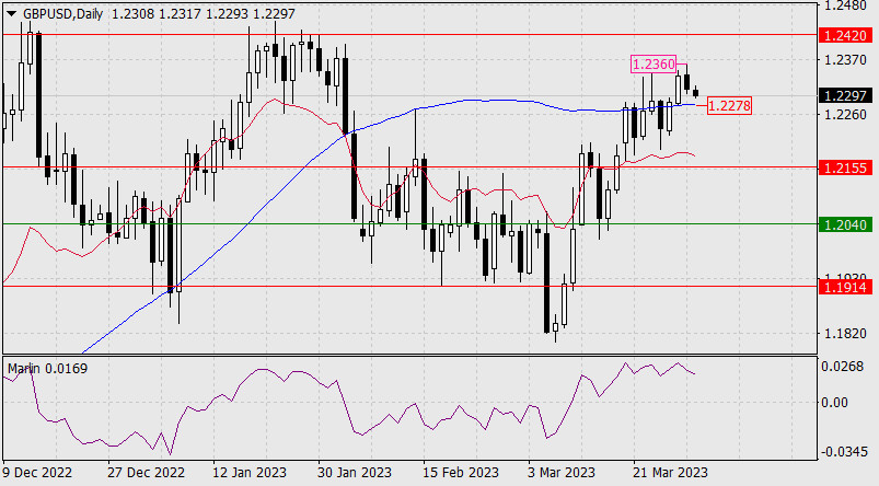 Прогноз по GBP/USD на 30 марта 2023 годаИнстаФорекс - Instaforex, 2 года назад Вчера фунт стерлингов, как и другие мировые валюты (особенно йена), отказался отрабатывать открывшиеся технические уровни и развернулся на понижение. Фунт потерял 27 пунктов, отказавшись от цели 1.2420. Впрочем, данный уровень очень сильный, его тестирование на общем нейтральном рыночном фоне вряд ли даст фунту какие-либо дальнейшие перспективы. Теперь цена может преодолеть поддержку 1.2278 и спуститься к поддержке 1.2155 для оценки нового баланса сил, так как это середина диапазона с середины декабря прошлого года.