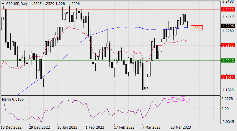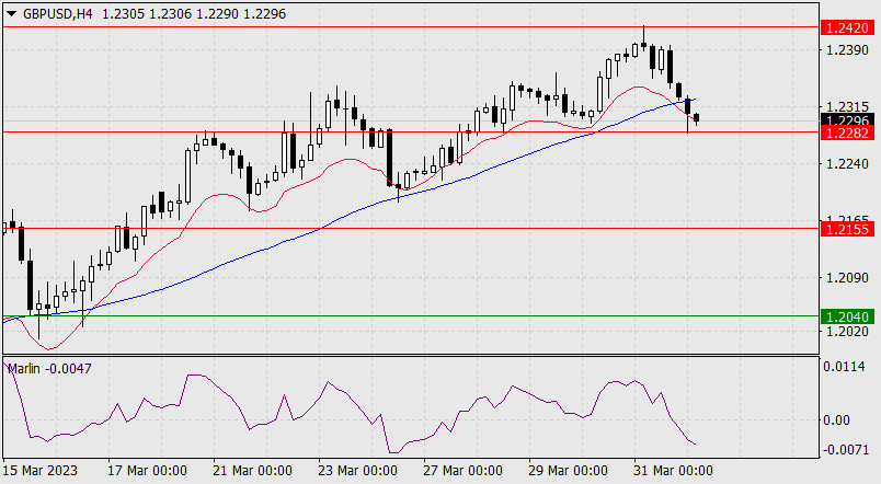 Прогноз по GBP/USD на 3 апреля 2023 годаИнстаФорекс - Instaforex, 2 года назад В пятницу фунт стерлингов развернулся вниз в точности от целевого уровня 1.2420. Глубина падения составила 53 пункта. Сигнальная линия осциллятора Марлин выходит из образованного ею графического флага вниз. Визуально эта сигнальная линия достигнет нулевой линии в тот момент, когда цена дойдёт до целевой поддержки 1.2155. От уровня ждём коррекцию. Для закрепления фунта в этом краткосрочном снижении цена должна преодолеть поддержку линии Крузенштерна (1.2282).