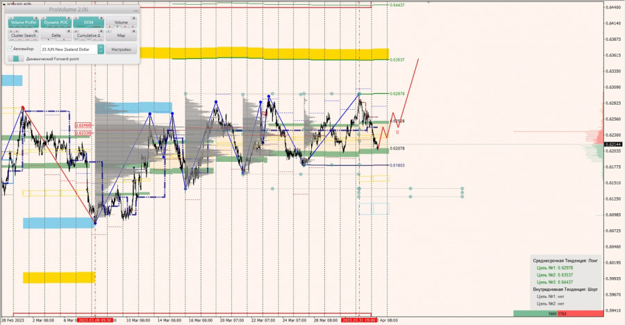 Среднесрочная тенденция: в лонг. Максимальное скопление объемов среднесрочной тенденции расположено в диапазоне по котировкам 0.62330-0.62460. В настоящий момент по паре совершаются инвестиционные операции ниже, указывая на слабость покупателей.