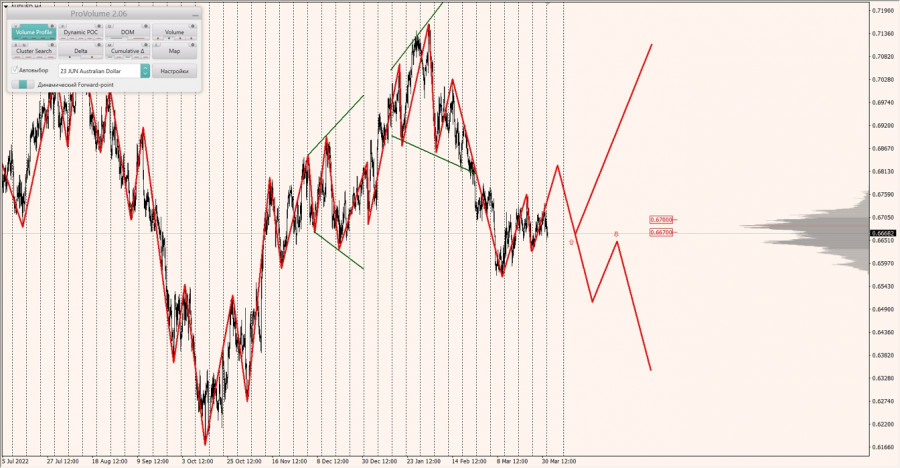 Долгосрочная тенденция: в шорт Максимальное скопление объемов текущего контракта расположено в диапазоне по котировкам 0.66700-0.67000. В настоящий момент по паре совершаются инвестиционные операции ниже, указывая на силу продавцов.