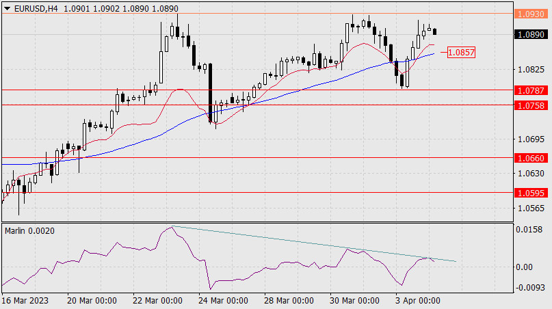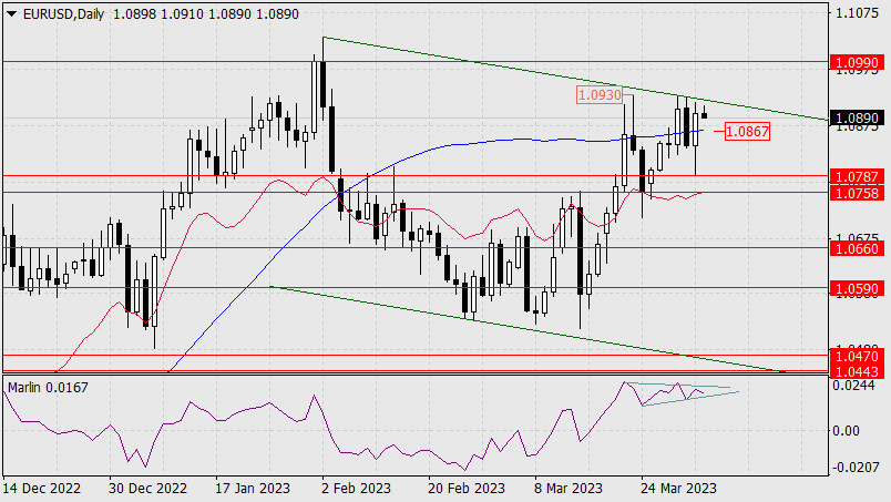 Прогноз по EUR/USD на 4 апреля 2023 годаИнстаФорекс - Instaforex, 2 года назад Евро резко изменил уже сложившееся понижающееся настроение в пятницу, подскочив в понедельник на 120 пунктов от минимума дня – от поддержки целевого уровня, а точнее, верхней границы целевого диапазона 1.0758/87. Цена опять консолидируется над индикаторной линией Крузенштерна под верхней границей зелёного ценового канала. Выход над контрольный уровень 1.0930 откроет цель 1.0990.