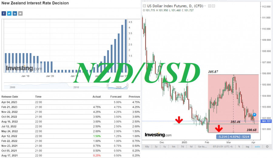 NZD/USD: краткие итоги и ближайшие перспективыИнстаФорекс - Instaforex, 2 года назад Завтра свое заседание, посвященное вопросам монетарной политики, проведет РБ Новой Зеландии. Экономисты ожидают повышение ключевой процентной ставки (OCR) на 25 б.п., до 5,00%, после чего руководители ЦБ Новой Зеландии, вероятно, возьмут паузу в текущем цикле ужесточения политики, чтобы оценить итоги 11 подряд повышений процентной ставки, начиная с октября 2021 года и уровня 0,25%. Несмотря на высокий уровень инфляции в стране, РБНЗ, видимо, придется отказаться от дальнейшего повышения ставок, особенно в свете надвигающейся рецессии и резкого роста миграции внутри страны. В последнем отчете Новозеландского института экономических исследований (NZIER) также ожидается повышение процентной ставки «на 25 базисных пунктов, учитывая, что инфляционное давление в экономике все еще остается высоким, а инфляционные ожидания остаются выше целевого диапазона инфляции Резервного банка на уровне 1%–3%». В NZIER также рекомендуют руководителям РБНЗ «приостановить повышение официальной денежной ставки (OCR) после апреля, но в течение некоторого времени поддерживать ставку на высоком уровне, чтобы снизить инфляцию», учитывая также «повышенный риск надвигающейся рецессии». Таким образом, логично предположить, что если РБНЗ так и поступит завтра, то NZD может попасть под давление. Впрочем, его динамика, скорее всего, будет похожа на сегодняшнюю динамику австралийского доллара, который лишь умеренно снизился после сегодняшнего решения РБА сделать паузу в повышениях ставки. Между тем американский доллар продолжает оставаться под давлением, в то время как его индекс DXY показывает сегодня смешанную динамику, хотя и смог обновить в начале сегодняшней европейской торговой сессии 9-недельный минимум на отметке 101.46. Опубликованный во вторник отчет ISM показал, что деловая активность в производственном секторе США в марте продолжала сокращаться ускоряющимися темпами: индекс деловой активности PMI в производственном секторе в марте снизился до 46,3 (против 47,7 в феврале и прогноза 47,5). Аналогичный показатель от S&P Global скорректировался с 49,3 до 49,2 в марте, также по-прежнему оставаясь ниже отметки 50,0, которая отделяет рост бизнес-активности от замедления. Индекс новых заказов в производственном секторе, присутствовавший во вчерашнем отчете ISM, также в марте снизился (до 44,3 против 47,0 в феврале и прогноза 44,6). Завтра будет опубликован новый блок важнейшей макро статистики из США (подробнее см. в Важнейшие экономические события недели 03.04.2023 – 09.04.2023). Что касается пары NZD/USD, то на момент публикации данной статьи она торговалась вблизи отметки 0.6295, показывая смешанную флэтовую динамику накануне завтрашнего заседания РБНЗ. В целом пара двигается в восходящих краткосрочном и среднесрочном трендах, оставаясь при этом пока что в рамках глобального нисходящего тренда. Для продолжения восходящей динамики паре необходимо преодолеть сильный уровень сопротивления 0.6305 (подробнее см. в «NZD/USD: сценарии динамики на 04.04.2023»). А из новостей на сегодня, касательно пары NZD/USD, стоит обратить внимание на публикацию в 14:00 данных по производственным заказам в США за февраль и после 14:00 (GMT) индекса цен на молочную продукцию, который отражает средневзвешенную цену 9 молочных продуктов, проданных на аукционе, организованном