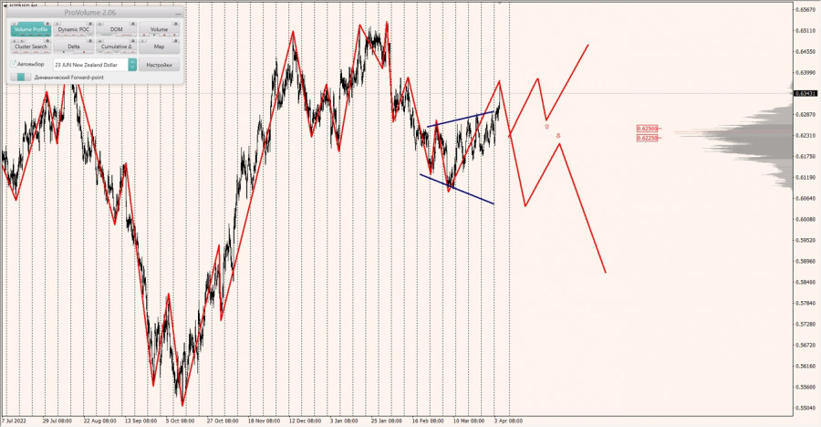 Среднесрочная тенденция: в лонг. Максимальное скопление объемов среднесрочной тенденции расположено в диапазоне по котировкам 0.62330-0.62460 и 0.62910-0.62960. В настоящий момент по паре совершаются инвестиционные операции выше, указывая на силу покупателей.