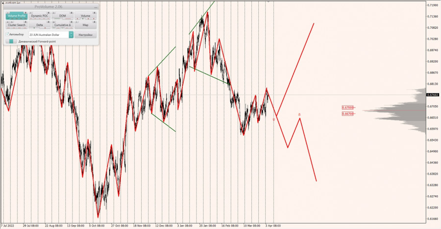 Долгосрочная тенденция: в лонг. Максимальное скопление объемов текущего контракта расположено в диапазоне по котировкам 0.66700-0.67000. В настоящий момент по паре совершаются инвестиционные операции выше, указывая на силу покупателей.