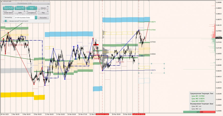 Среднесрочная тенденция: в лонг. Максимальное скопление объемов среднесрочной тенденции расположено в диапазоне по котировкам 0.66765-0.66900. В настоящий момент по паре совершаются инвестиционные операции выше, указывая на силу покупателей.