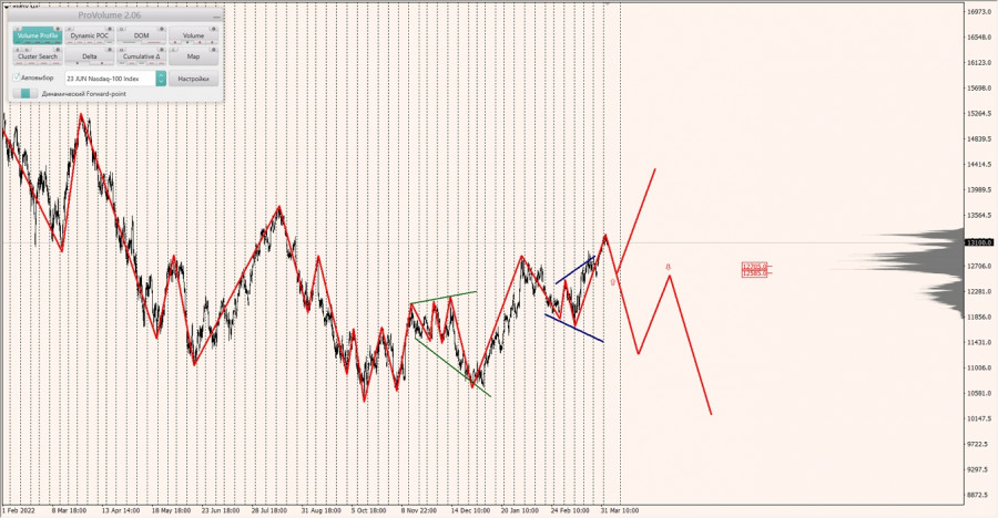 Долгосрочная тенденция: в лонг. Максимальное скопление объемов текущего контракта расположено в диапазоне по котировкам 12585.0-12705.0. В настоящий момент по Nasdaq совершаются инвестиционные операции выше, указывая на силу покупателей.