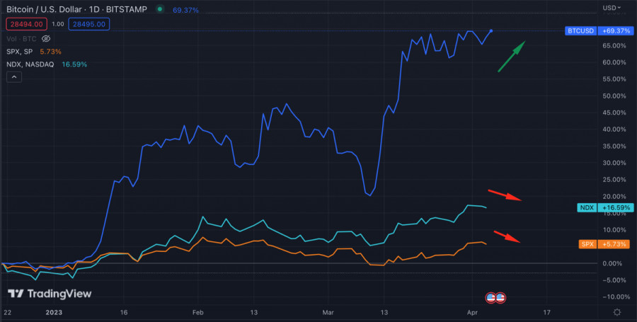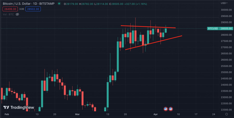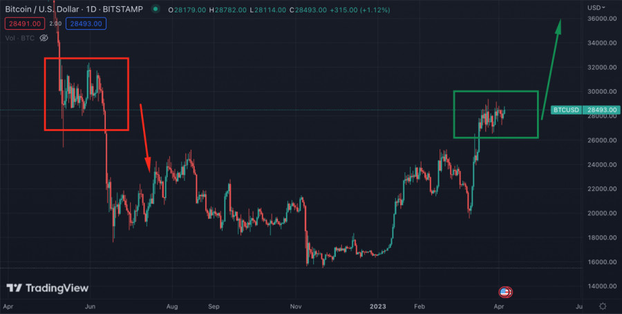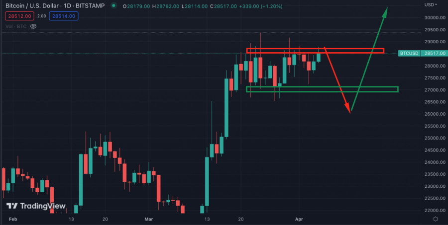 Институционалы наращивают инвестиции в BTC на фоне банковского кризиса и нефтяного шокаИнстаФорекс - Instaforex, 2 года назад Биткоин продолжает консолидационное движение в рамках привычного диапазона $26,6k-$29,1k. За последние сутки криптовалюта выросла в цене на 1,2%, что указывает на минимальную торговую активность на рынке. При этом BTC удалось восстановиться к уровню $28,5k после снижения к $27,7k. Это указывает на постепенное завершение периода консолидации и формирование фигуры теханализа "клин", который в конечном итоге будет пробит всплеском волатильности и объемов торгов. Цена BTC имеет больше шансов совершить бычий выход за пределы текущего диапазона за счет совокупности фундаментальных и технических факторов. Вместе с тем достижение Биткоином уровня $28k сопровождалось увеличением процента манипулятивных инвесторов, а потому нельзя полностью исключать возможности нисходящего пробоя. Крупные фонды смотрят в сторону BTC на фоне нового этапа мирового кризисаВопреки всем пессимистичным ожиданиям и прогнозам первый квартал 2023 года завершается на позитивной ноте. Индекс SPX достиг уровня $4100, Биткоин вплотную подобрался к $30k, а программа количественного сокращения ФРС постепенно завершается. При этом в мировой экономике остается нерешенной проблема высокой инфляции, которая усугубилась банковским кризисом в США. Также на днях стало известно, что основные страны-доноры нефти сокращают добычу черного золота на миллион баррелей в день. Это решение в совокупности с "печатным станком" ФРС может спровоцировать очередной этап мирового кризиса. Аналитики JPMorgan считают, что рынок акций США обновит локальные минимумы 2022 из-за совокупности проблем в банковской сфере, очередном обострении кризиса энергоресурсов и приближающемся замедлении экономики Штатов. Однако судя по всему, положение Биткоина во время нового этапа кризиса окажется другим. Ведущие аналитические издания связывают текущий консолидационный период с активностью крупных фондов. Можно предположить, что цена BTC аккумулирует большие объемы средств для дальнейшего восходящего движения. С этой точки зрения ситуация кажется зеркальной событиям мая 2022 года. Как сообщают аналитики Brown Brothers Harriman, за последний месяц институциональные инвесторы проявляют большой интерес к BTC и другим криптовалютам. Santiment подтверждает наличие бычьих настроений на рынке цифровых активов. Анализ BTC/USDЕсли фундаментальный фон указывает на формирование бычьей тенденции, то с технической стороны актив выглядит по-медвежьи. Прежде всего BTC не удалось закрепиться внутри сложной области сопротивления, что привело к стагнации восходящего тренда и возрастании настроений на продажу активов. Эта тенденция нашла свое отражение в действиях долгосрочных и краткосрочных инвесторов, а также BTC-майнеров. Эти действия способствовали началу консолидационного периода. Учитывая постепенное поджатие цены, процесс фиксации прибыли практически завершен. Добавляет напряженности ситуации агрессивная регуляторная политика развитых стран. При этом стоит отметить, что Glassnode фиксируют приверженность долгосрочных инвесторов Биткоину и отсутствие крупных распродаж. Учитывая это, настроения рынка становятся позитивными. ИтогиНесмотря на сохранение веры в фундаментальные ценности Биткоина, инвесторы склонны к сниже
