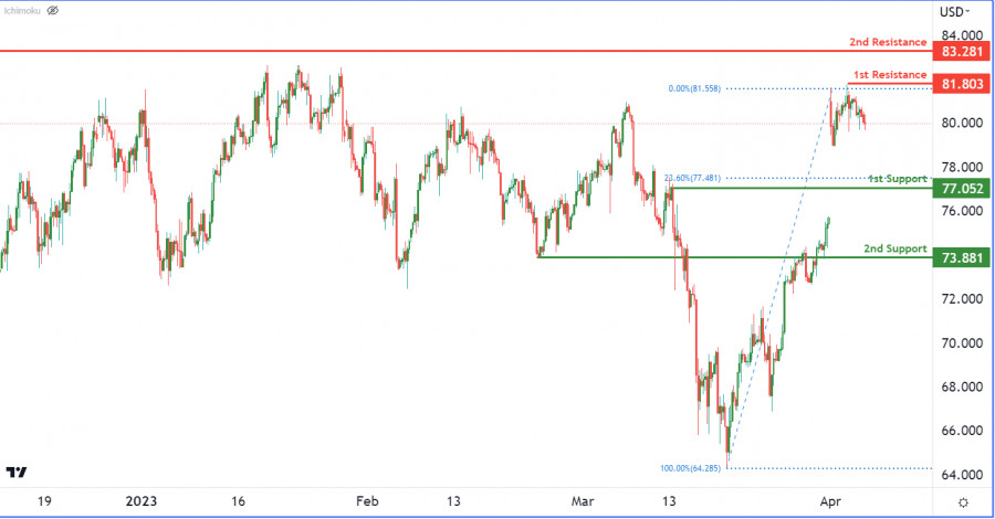 Нефть марки WTI торгуется с понижением. Прогноз на 6 апреля 2023 г.ИнстаФорекс - Instaforex, 2 года назад Нефть марки WTI в настоящее время развивает медвежий импульс, что указывает на возможное продолжение нисходящего движения. Первый уровень поддержки находится на уровне 77.05, который совпадает с уровнем коррекции Фибоначчи 23.60%. Прорыв ниже этого уровня может сигнализировать о дальнейшем развитии медвежьего импульса, что делает этот уровень важным для наблюдения. Второй уровень поддержки, за которым также необходимо следить, расположен на отметке 73.88. Что касается сопротивления, 1-й уровень сопротивления находится на отметке 81.80, которая представляет собой уровень свинг-хай. Прорыв выше этого уровня может сигнализировать о развороте медвежьего импульса. Второй уровень сопротивления расположен на отметке 83.28, которая является еще одним уровнем свинг-хай. Материал предоставлен компанией InstaForex - www.instaforex.com |