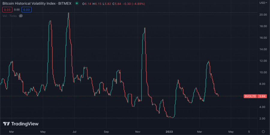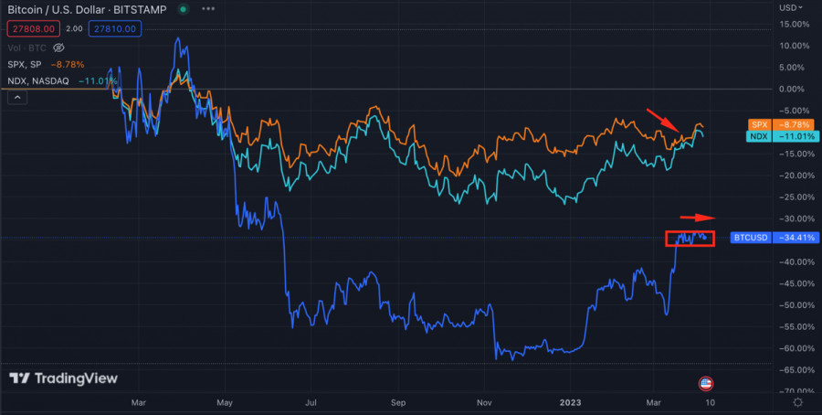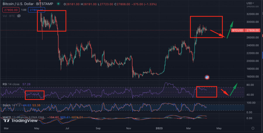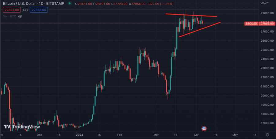 Пружина сжимается: Биткоин ожидает всплеск волатильностиИнстаФорекс - Instaforex, 2 года назад Биткоин продолжает консолидацию в рамках диапазона $26,6k-$29,1k. Актив движется в обозначенном коридоре уже вторую неделю кряду. Параллельно наблюдается снижение внутридневной торговой активности до локальных минимумов. Однако полагать, что это связано со снижением интереса к Биткоину не стоит, так как параллельно происходят консолидационные процессы. Крупные и долгосрочные инвесторы перераспределяют накопленный и зафиксированный в USDT капитал, чтобы сформировать новый пласт ликвидности в зоне $26,6k-$29,1k. Подобные процессы происходят каждый раз, когда цена криптовалюты совершает мощный рывок на больших объемах торгов. Консолидационный период длится от одной до нескольких недель и завершается резким всплеском волатильности. По состоянию на 6 апреля BTC вплотную приблизился к моменту выхода за пределы текущего диапазона. Биткоин – независим?За последний месяц мы увидели бычье движение как на криптовалютах, так и фондовых индексах. SPX достиг отметки $4100, а NDX завершил март на обновленных локальных максимумах. Биткоин достиг потолка на отметке $29,2k, однако, в отличие от фондовых индексов, сохранил высокие позиции. В результате мы увидели еще несколько попыток бычьего движения от BTC, в то время как бычий запал фондовых индексов исчерпался. Это говорит о том, что криптовалюта становится более значимым активом, чем рынок акций. Массовые сокращения в 500 крупнейших компаниях США лишь усилят эту тенденцию. При этом эксперты Deutsche Bank заявляют, что после начала банковского кризиса в США ситуация может усугубиться. Аналитики допускают начало кредитного кризиса, который негативно отразится на способности экономики к росту. При этом в банке сообщают, что по состоянию на апрель 2023 вероятность рецессии мировой экономики оценивается в районе 90%. Учитывая, что все макропроблемы неразрывно связаны с инфляцией и политикой ФРС, Биткоин рискует оказаться в выигрыше. Актив может стать эффективным убежищем от инфляции, и вместе с тем его капитализация будет расти из-за действий ФРС по стимулированию отдельных отраслей. Анализ BTC/USDИ несмотря на то что сейчас рано говорить о рецессии и повторном росте инфляции, крупные фонды предпринимают действия, чтобы обеспечить безопасность капитала в будущем. И последние тенденции указывают на то, что BTC может стать ключевым сберегательным средством. Прорыв текущего диапазона колебаний и достижение активом отметки $31k станет ярким подтверждением аккумуляционной политики крупного капитала. При таком развитии событий оставшуюся часть весны BTC проведет в рамках диапазона $30k-$40k. Вместе с тем существует вероятность нисходящего прорыва, так как во многом текущее восходящее движение было построено на крупных перемещениях капитала "криптокитами". Доля ликвидности ФРС и крупных фондов составляет меньше 50% от объемов, позволивших BTC достичь $28k. В то же время мы видим сигналы от MicroStrategy, которая в очередной раз приобретает 1045 BTC на $29,3 миллиона. Это говорит о том, что руководство компании не рассматривает снижение цены Bitcoin в ближайшее время. Возможно это и манипуляция, однако для большинства инвесторов это бычий сигнал. Тем временем на дневном графике BTC/USD продолжает формироваться фигура теханализа "клин", которая в ближайшее время