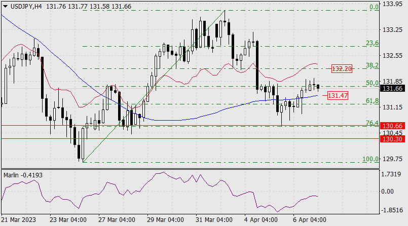 Прогноз по USD/JPY на 7 апреля 2023 годаИнстаФорекс - Instaforex, 2 года назад Паре USD/JPY удалось углубить коррекцию до уровня 76,4%, после чего цена закрепилась над индикаторной линией Крузенштерна четырёхчасового масштаба и отработала уровень Фибоначчи 50%. Для закрепления растущего потенциала необходимо преодоление минимумов 4 апреля и 30 марта, совпадающего с уровнем Фибоначчи 38,2%. Закрепление цены под линией Крузенштерна (131.47) позволит цене повторно атаковать ключевые поддержки 130.66 и 130.30.