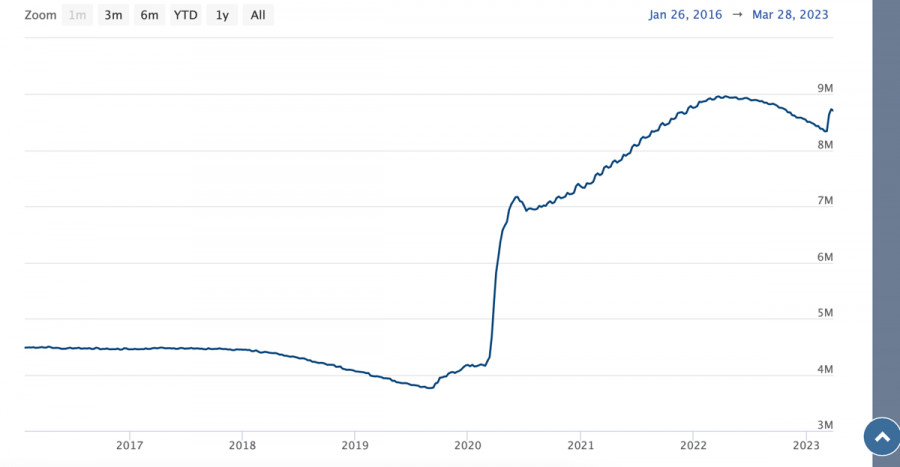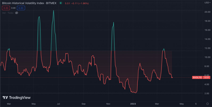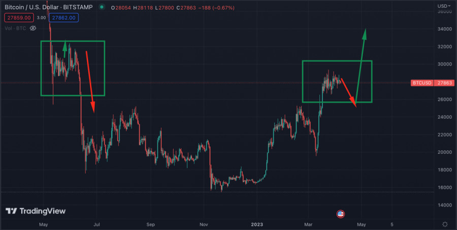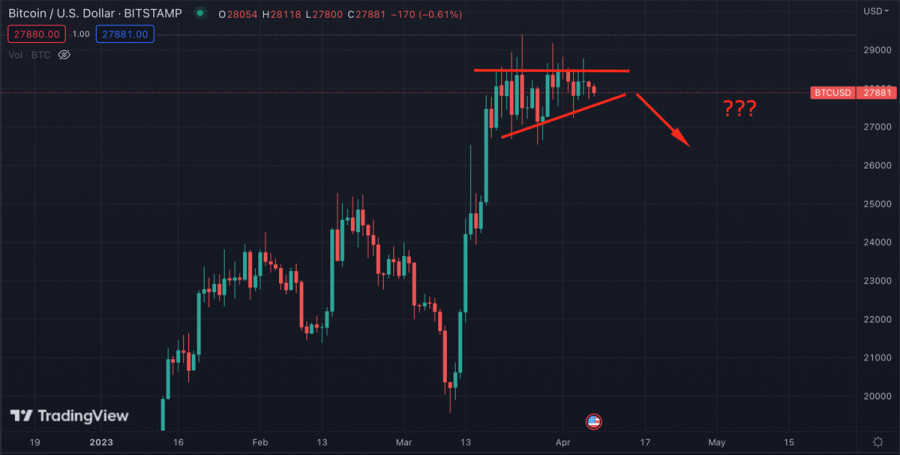 Биткоин постепенно переходит к стадии коррекции: где проходит конечный потенциал нисходящего движения?ИнстаФорекс - Instaforex, 2 года назад Биткоин завершает очередную рабочую неделю на минорной ноте в рамках консолидационного движения. Перераспределение капитала продолжается, но, учитывая низкую способность BTC тестировать верхнюю границу текущего канала колебаний, складывается впечатление, что крупные игроки хотят набрать позиции ниже $26k. Тенденция по наращиванию объемов при нисходящем движении, которая начала проявляться в конце марта, приближается к своему максимуму. Покупателям все сложнее удерживать рубежи, что приводит к постепенному снижению верхней границы узкого канала колебаний. Падение бычьих настроений также провоцируется нестабильной макроэкономической ситуацией. Казалось бы, ослабление традиционных институций должно позитивно сказаться на настроениях криптоинвесторов, однако, как мы видим, текущих объемов недостаточно для реализации бычьего импульса. Лед тронулся на рынке трудаКлючевым событием последних дней на макроарене стал выход отчетности по рынку труда в США. Это была единственной институцией, которая упорно сохраняла стабильность и силу на протяжении большей части дистанции агрессивной политики ФРС. Однако последние результаты показали, что вслед за банковской системой рынок труда также начал сбоить. Число первичных заявок на получение пособий по безработице в США достигло 228 тысяч при ожиданиях в районе 200 тысяч. Общее число лиц, получающих пособия по безработице 1,8 миллиона при прогнозе 1,7 миллиона. В ближайшее время ситуация усугубится, так как крупнейшие компании США только начинают реализацию политики сокращения кадрового состава. Большое число безработных может привести к возникновению дополнительной нагрузки на банковский сектор и спровоцировать локальный кризис кредитования. Для Биткоина и рынка криптовалют это позитивный сигнал, так как ФРС будет бороться с подобным проблемами раздуванием балансов. Как показало мартовское ралли цены, часть объемов ФРС оседает на крипторынке. Однако в долгосрочной перспективе BTC также пострадает от текущих событий, так как все сегодняшние действия приближают рецессию. Анализ BTC/USDЗа последнюю неделю ситуацию вокруг BTC/USD кардинально не изменилась. Актив продолжает консолидацию в рамках широкого диапазона $29,1k-$26,6k. Тенденция на коррекцию действительно прослеживается за счет постепенного нарастания объемов при снижении. Помимо этого, за неделю мы не увидели ни одной попытки обновить локальный максимум, установленный 30 марта на отметке $29,2k. Это может указывать на то, что нас ожидает импульсное нисходящее движение для набора позиций и возобновления восходящего движения выше $30k. Такой сценарий станет вероятным, если к завершению текущей недели BTC не удастся закрепиться выше уровня $28,5k. По состоянию на 11:00 на дневном графике отсутствуют какие-либо вменяемые бычьи сигналы. Объемы торгов и сетевая активность также остается на низком уровне. В случае успешного закрепления Биткоина выше $28,5k, цена актива двинется к следующему ключевому рубежу – $29,1k. Здесь начинается широкая зона проторговки, сформированная весной 2022. Пробой данного рубежа будет возможен лишь при объемах крупного капитала, который до сегодня ведет себя пассивно. ИтогиУчитывая 