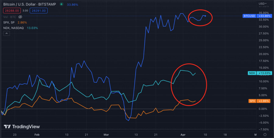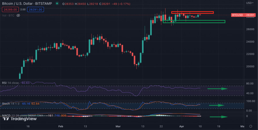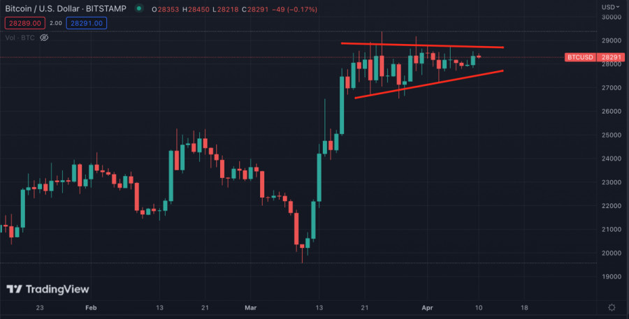 Биткоин продолжает консолидироваться в преддверии закрытого заседания ФРС и данных по инфляцииИнстаФорекс - Instaforex, 2 года назад Биткоин завершил вторую флэтовую торговую неделю в рамках диапазона $26,6k-$291,k. Криптовалюта совершает локальные ценовые рывки, но не выходит за пределы текущего диапазона, что указывает на низкую рыночную активность и отсутствие крупных игроков. Цифровой актив дотерпел до того момента, когда важное макроэкономическое событие может растормошить рынок. Вторая неделя апреля будет крайне волатильной из-за большого количества важных для экономики событий. Учитывая это стоит ожидать повышение рыночной активности и выход BTC за рамки текущего диапазона. Экстренное заседание ФРС и статистика по инфляцииЭта неделя начнется с уже привычного, но от этого не менее интригующего события – экстренного закрытого заседания ФРС. Точная причина нештатной встречи чиновников неизвестна, но вероятней всего это будет касаться проблемы инфляции. Сегодняшнее заседание ФРС и его результаты могут стать катализатором для всплеска волатильности и торговой активности на рынке криптовалют. Через два дня, в среду, выходят данные по инфляции, которые могут кардинально повлиять на политику регулятора. Первым сигналом к возможным изменениям стала негативная реакция рынка на относительно стабильную статистику по рынку труда. Учитывая проблемы в мировой экономике большинство нейтральных новостей будут восприниматься с оттенком негатива, а потому у BTC будет больше шансов начать снижение. Согласно опросу BBG рынки свопов и крупные инвесторы закладывают 60% вероятность повышения ставки ФРС в мае. Помимо этого Goldman Sachs предрекает худший сезон отчетностей в США. В 1 квартале прибыль компаний S&P 500 снизится на 7%. В то же время по состоянию на 10 апреля Биткоин вновь начинает укреплять свою корреляцию с фондовыми индексами. За последние два года такое происходило в преддверии сильных нисходящих движений обоих рынков. Учитывая грядущий сезон отчетностей, SPX рискует утянуть BTC вниз за собой. Анализ BTC/USDКардинальных изменений на рынке BTC не наблюдается. Актив продолжает консолидационное движение в рамках широкого диапазона $26,6k-$29,1k. При этом уже неделю происходит локальное поджатие цены вблизи уровня $28k. Учитывая все события текущей недели, Биткоин совершит импульсный выход за пределы данной зоны. Продолжается период активного накопления со стороны крупных фондов. Согласно данным Santiment "киты" с балансами от 10 000 BTC до 100 000 BTC накопили более 70 000 BTC за последнюю неделю. В рамках текущего консолидационного движения активное накопление криптовалюты крупными инвесторами является главным сигналом к бычьему пробою "клина". Вместе с тем на рынке постепенно начинают преобладать медвежьи настроения, однако этот перевес минимальный. Грядущий импульс будет необходим для сбора ликвидности за нижней и верхней границей текущего канала колебаний. Учитывая это вероятность восходящего/нисходящего движения цены примерно равны. На дневном графике мы видим относительное спокойствие BTC/USD. Криптовалюта движется в рамках текущего диапазона с минимальными отклонениями от курса. Стохастический осциллятор и индекс RSI продолжают указывать на движение по флэту без сигналов к изменению ситуации. ИтогиРезультаты заседания ФРС и данные по инфляции окажут сил