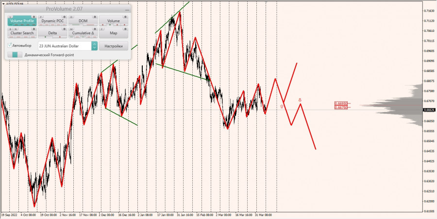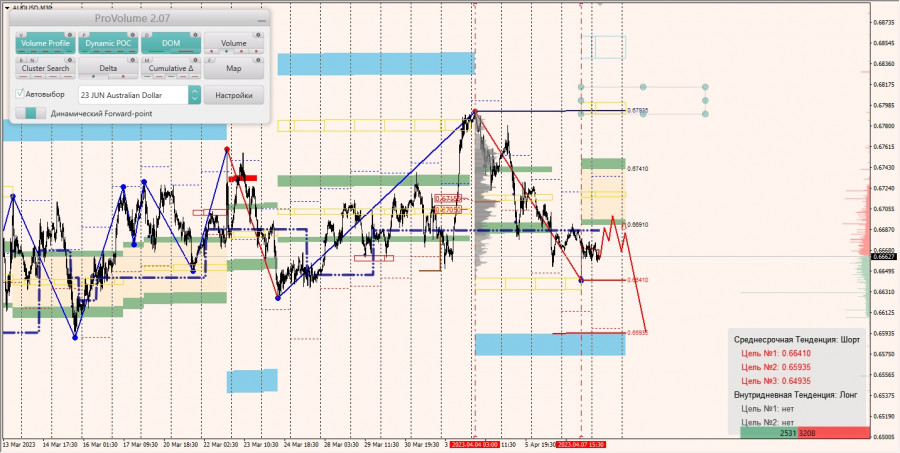 Среднесрочная тенденция: в шорт. Максимальное скопление объемов среднесрочной тенденции расположено в диапазоне по котировкам 0.67050-0.67150. В настоящий момент по паре совершаются инвестиционные операции ниже, указывая на силу продавцов.