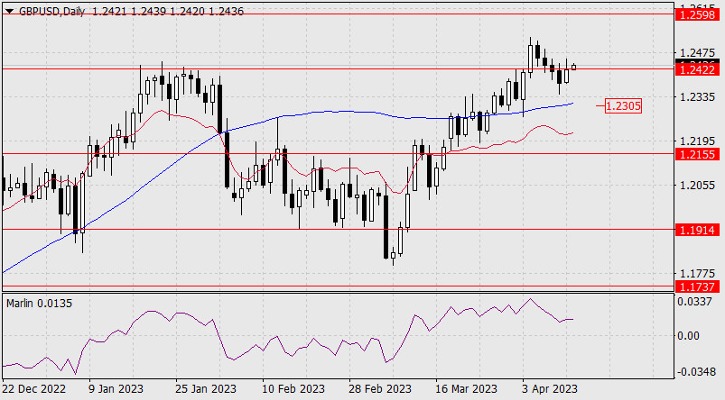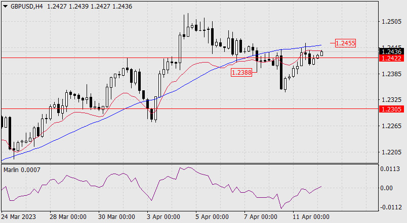 Прогноз по GBP/USD на 12 апреля 2023 годаИнстаФорекс - Instaforex, 2 года назад Во вторник британский фунт проколол сопротивление 1.2422 верхней тенью дневной свечи, а сегодня утром показывает намерение продолжить рост. Главным событием дня сегодня будет выход данных по инфляции в США за март. Если они покажут заметное снижение ИПЦ, то развитие роста фунт получит, и целевой уровень 1.2598 в ближайшие дни может быть достигнут. Если фунт не получит фундаментальной помощи, то, после закрепления под 1.2422, цена попытается преодолеть поддержку 1.2305, образованную линией Крузенштерна. В этом случае откроется цель 1.2155.
