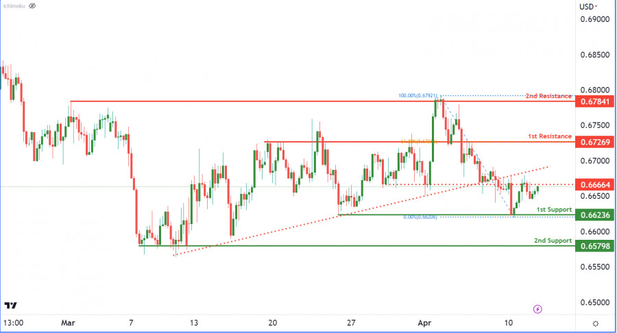 В настоящий момент на графике AUD/USD наблюдается медвежий настрой, поскольку цена находится ниже основной нисходящей линии тренда, что подтверждает медвежий импульс. Если пара продолжит нисходящий тренд, цена может оттолкнуться от 1-го уровня сопротивления на отметке 0,6726 и пойти вниз к 1-му уровню поддержки на отметке 0,6623, а затем и ко 2-ой поддержке на уровне 0,6579. Напротив, если цена пробьется выше 1-го уровня сопротивления, то рост может продолжиться ко 2-му сопротивлению на уровне 0,6784, который также является локальным максимумом. Промежуточное сопротивление на уровне 0,6666 также может стать потенциальным началом сильного бычьего импульса по направлению ко 2-му уровню сопротивления.