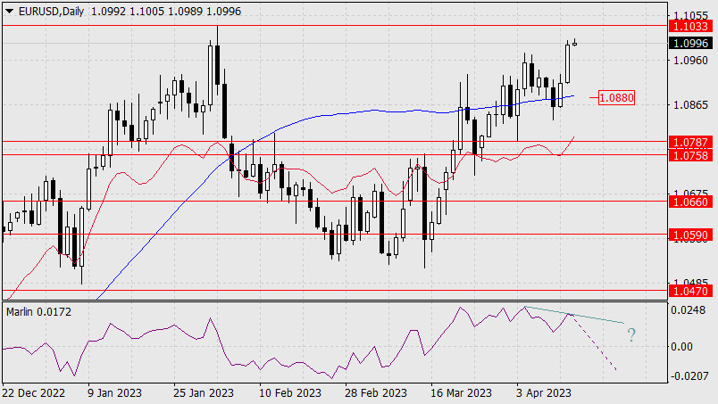 Прогноз по EUR/USD на 13 апреля 2023 годаИнстаФорекс - Instaforex, 2 года назад Итак, из четырёх представленных во вчерашнем обзоре вариантов развития событий, евро избрал сценарий роста с образованием дивергенции, которая сейчас сформировалась на графике дневного масштаба. Подтверждение данная формация ещё не получила, поэтому целевой уровень 1.1033 вполне может быть отработан. Дивергенция в этом случае станет менее крутой. Подтверждением разворота станет уход цены под индикаторную линию Крузенштерна, ниже отметки 1.0880.