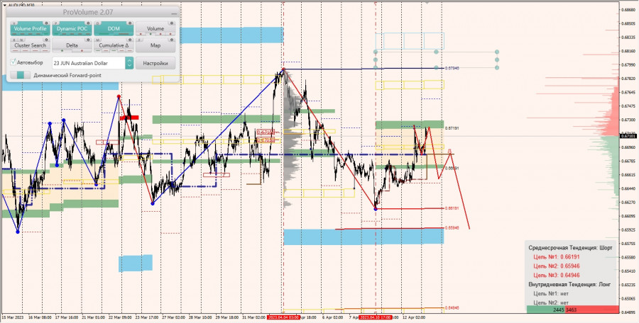 Среднесрочная тенденция: в шорт. Максимальное скопление объемов среднесрочной тенденции расположено в диапазоне по котировкам 0.67050-0.67150. В настоящий момент по паре совершаются инвестиционные операции внутри указанного диапазона, указывая на временную неопределенность.