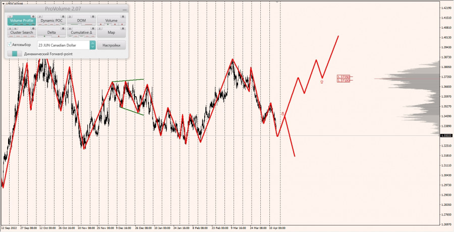 Область выгодных цен на покупку с точки зрения маржинального обеспечения располагается между зонами 1/4 и 1/2, построенными от максимума 13.04.2023.