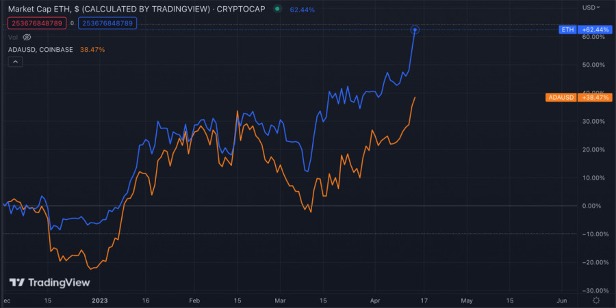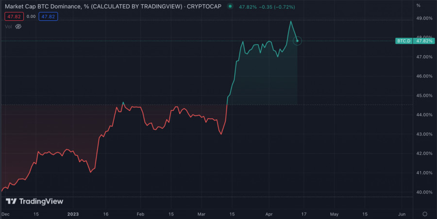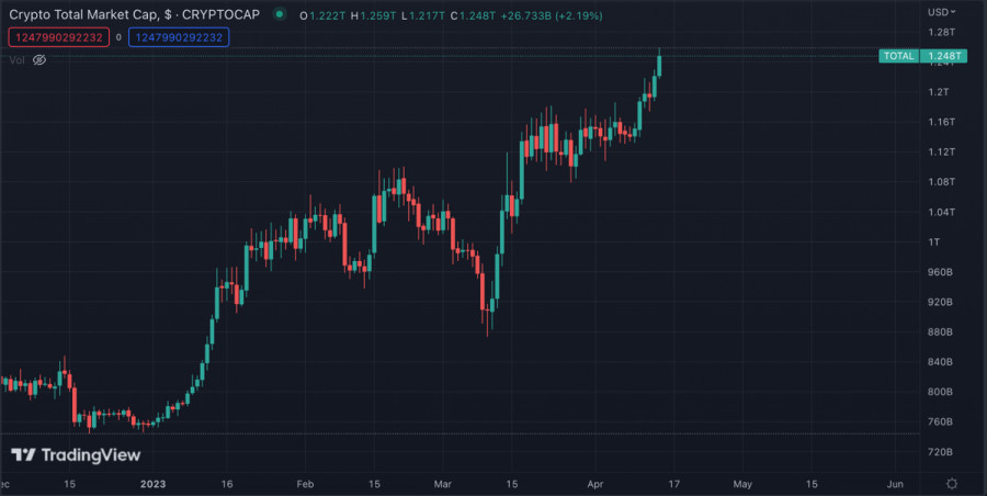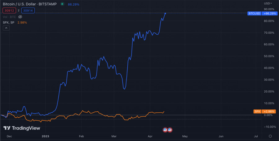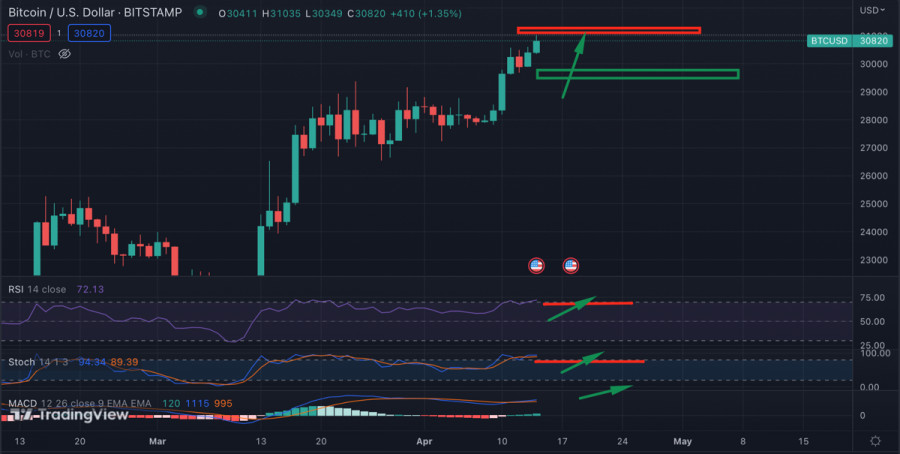 Биткоин продолжает восходящее движение при растущих объемах торговИнстаФорекс - Instaforex, 2 года назад За последние три месяца мы увидели бычье ралли Биткоина почти на 100%. Настроения инвесторов постепенно сменяется на уверенно бычьи и главными вопросами становится время, на протяжении которого BTC пробьет очередной уровень сопротивления. За последний месяц Биткоину удалось сформировать мощную линию поддержки вблизи уровня $28,5k. Также актив обновил локальный максимум выше уровня $30,5k, и продолжает восходящее движение. Вероятней всего Биткоин продолжит восходящее движение и обновит локальный максимум выше отметки $31k. Фундаментальный фонБиткоину удалось вернуться в топ-10 активов по рыночной капитализации благодаря мощному бычьему движению. Несмотря на это актив сохраняет взаимосвязь с фондовыми активами, и в первую очередь SPX. Уровень корреляции двух инструментов по-прежнему выше 80%. Главным катализатором роста котировок Биткоина и других высокорисковых активов стало снижение уровня инфляции, а также локальное стимулирующее движение для банковской системы от ФРС. Благодаря совокупности этих факторов на рынке фьючерсов возросли ожидания того, что ставка не будет повышена в мае. Однако как сообщает WSL, ФРС не собирается отказываться от повышения ключевой ставки в мае, несмотря на снижение инфляции до двухлетнего минимума. Также сообщается, что регулятор понимает риски возникновения рецессии, но монетарную политику менять не собирается. Анализ BTC/USDЗа последние два дня капитализация крипто рынка выросла более, чем на 7% и достигла отметки $1,29 триллиона. Несмотря на это объемы инвестиций в крипто и блокчейн проекты в первом квартале 2023 года составили всего $2,4 миллиарда, что является наименьшим показателем с конца 2020. При этом есть все основания полагать, что ситуация серьезно улучшится во втором квартале за счет очередного этапа бычьего ралли Биткоина. На рынке появляются первые сигналы ралли альткоинов, и успешное обновление Ethereum ознаменовало первый этап ралли остального крипто рынка. Уровень доминирования Bitcoin по-прежнему находится выше отметки 45%, однако за последние два дня мы видим тенденцию к снижению. Это говорит о том, что все больше инвестиций поступают в альтернативные криптовалюты, в первую очередь ETH, ADA и SOL. В техническом плане Биткоин продолжает демонстрировать потенциал для достижения уровня $31k. На дневном графике актива индекс RSI возобновил восходящее движение выше отметки 70, а по стохастику сформировалось очередное бычье пересечение. При этом MACD также продолжает восходящее движение, что подтверждает бычий настрой рынка. Вопросы вызывает стохастик, который сформировал два локальных импульса за последние три дня. Это может свидетельствовать о том, что бычий потенциал в рамках текущего восходящего движения постепенно снижается. Однако BTC/USD по силам совершить финальный рывок и обновить локальный максимум. По состоянию на 11:00 криптовалюта находится вблизи уровня $30,9k, и постарается совершить бычий пробой психологической отметки $31k. Это станет финальным аккордом текущего бычьего движения, так как по всем параметрам актив приближается к локальной перегретости. ИтогиБиткоину удалось обновить локальный максимум в рамках текущего этапа бычьего движения. Покупательские объемы постепенно снижаются при реал