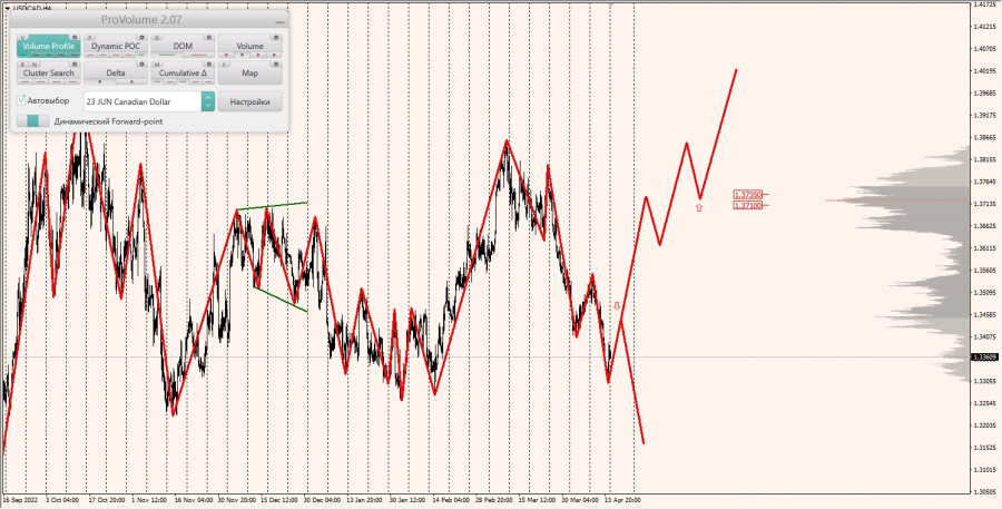 Область выгодных цен на покупку с точки зрения маржинального обеспечения располагается между зонами 1/4 и 1/2, построенными от максимума 14.04.2023.