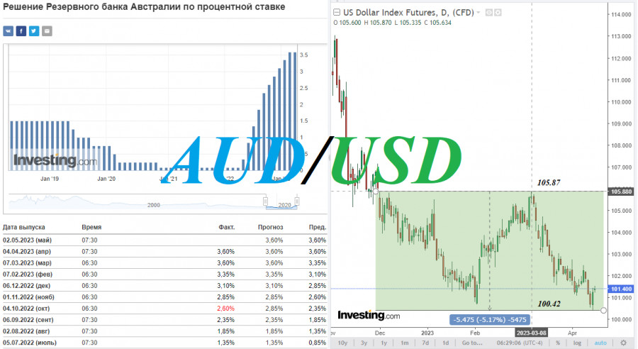 AUD/USD: стоит ли ждать дальнейшего повышения процентных ставок?ИнстаФорекс - Instaforex, 2 года назад Как мы отметили в нашем сегодняшнем обзоре «Доллар: краткие итоги и ближайшие перспективы», американский доллар пытается развить восходящую коррекцию, ожидая также новых драйверов для укрепления накануне заседания ФРС 2 – 3 мая. Однако, такие драйверы появятся, скорее всего, только на следующей неделе, когда будут представлены свежие данные по заказам на товары длительного пользования в США, предварительные данные по ВВП за 1-й квартал, которые, как ожидается, должны быть лучше, чем в предыдущем квартале (+2,7% против +2,6% в 4-м квартале 2022 года), и свежие данные по расходам/доходам американцев. В начале же этой недели интерес может представлять публикация завтра (в 01:30 GMT) протоколов с апрельского заседания РБА, блок важных макро данных из Китая (в 02:00), данных с британского рынка труда (в 06:00), индексов потребительских цен по Канаде (в 12:30). Динамику канадского доллара накануне этой публикации мы обсудим в нашем завтрашнем обзоре, а в сегодняшнем поговорим о динамике австралийского доллара и пары AUD/USD. В конце прошлой недели пара смогла пробиться в зону ключевых уровней сопротивления 0.6775, 0.6805, отделяющих среднесрочный бычий тренд от медвежьего. В целом, сохраняется глобальный нисходящий тренд (подробнее о динамике пары см. в «AUD/USD: сценарии динамики на 17.04.2023»), и при появлении сильных макро данных из США, риски возобновления снижения AUD/USD значительно вырастут. Как известно, в начале этого месяца, когда состоялось очередное заседание РБА, его руководители решили взять паузу в повышениях процентной ставки. Управляющий Резервного банка Австралии Филип Лоу заявил после этого заседания, что «может потребоваться дальнейшее ужесточение денежно-кредитной политики», а «решение о сохранении ставок на прежнем уровне не означает, что повышение процентных ставок закончено». Опубликованная ранее макро статистика из Австралии оказалась слабой. Так, индекс деловой активности PMI в сфере услуг страны от Commonwealth Bank в марте снизился с 50,7 до 48,2, составной PMI снизился марте до 48,1 с 50,6 в феврале, индекс (PMI) деловой активности в секторе обрабатывающей промышленности (от Commonwealth Bank of Australia и S&P Global) за март, который является важным индикатором состояния австралийской экономики в целом, хоть и вышел со значением лучше предыдущего (49,1 против 48,7), находится ниже определяющей отметки 50 и не смог поддержать AUD. Тем не менее, опубликованный в минувший четверг позитивный отчет по занятости в Австралии (прирост рабочих мест в марте составил 53 тысячи, на 20 тысяч выше ожиданий, а безработица снизилась на 0,1%, до 3,5%) оказывает поддержку AUD. Поэтому, участникам рынка, следящим за динамикой AUD, будет интересно узнать подробности итогов апрельского заседания РБА, чтобы точнее оценить перспективы австралийского доллара и пары AUD/USD, которая, как мы отметили выше, остается под медвежьим давлением. Если же в публикуемых завтра протоколах будут содержаться намёки на ужесточение монетарной политики в мае, это сдержит на какое-то время падение пары. Кроме того, австралийский доллар может завтра получить поддержку от данных из Китая, главного экономического партнёра страны, которые также будут опубликованы завтра (в 02:00 GMT), если они окажутся сильными(о важных событиях недели см. в Важнейшие эко