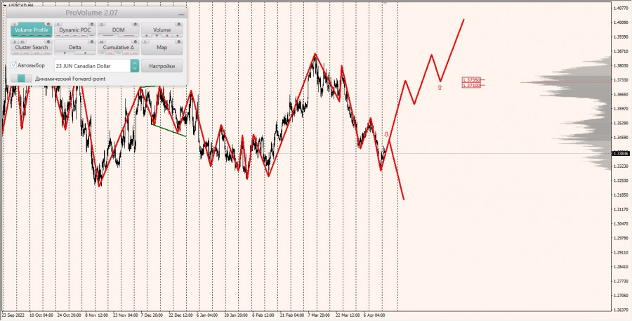 Область выгодных цен на покупку с точки зрения маржинального обеспечения располагается между зонами 1/4 и 1/2, построенными от максимума 14.04.2023.