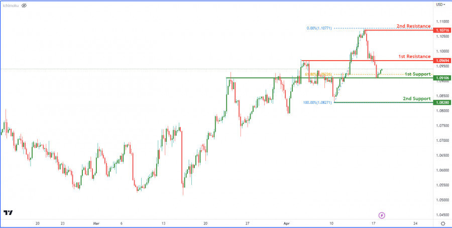 EUR/USD: ожидается рост до уровня сопротивления. Прогноз на 18 апреля 2023 г.ИнстаФорекс - Instaforex, 2 года назад На 4-часовом графике пара EUR/USD в настоящее время развивает бычий импульс. Ожидается, что цена продолжит рост к 1-му уровню сопротивления. При этом, имеется два сильных уровня поддержки, за которыми трейдерам следует следить. Первый уровень поддержки находится на уровне 1.0910, который представляет собой уровень свинг-лоу и совпадает с уровнем коррекции Фибоначчи 61.80%. В прошлом этот уровень оказывал сильную поддержку цене. Второй уровень поддержки расположен на отметке 1.0828 и также является уровнем свинг-лоу. Этот уровень неоднократно тестировался в прошлом, обеспечивая сильную зону поддержки для цены. Первый уровень сопротивления находится на отметке 1.0969, которая в прошлом оказывала сильное сопротивление цене. Второй уровень сопротивления расположен на 1.1071 и представляет собой уровень свинг-хай, который также неоднократно тестировался в прошлом и обеспечивает сильную зону сопротивления для цены. Соответственно, это может вызвать более мощный бычий отскок к 1-му уровню сопротивления. Материал предоставлен компанией InstaForex - www.instaforex.com |