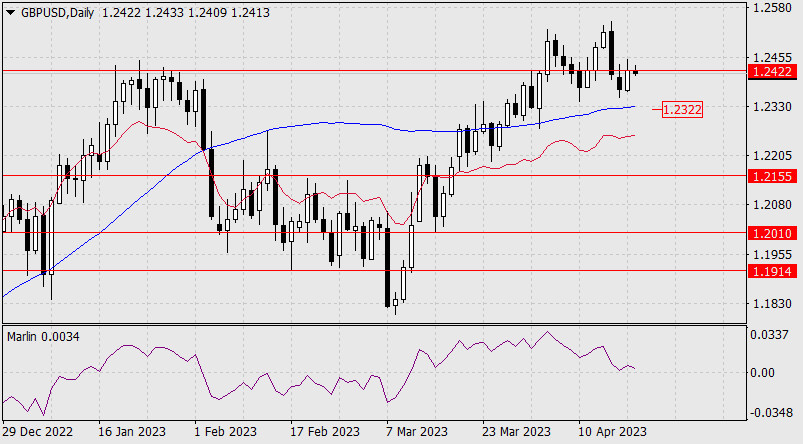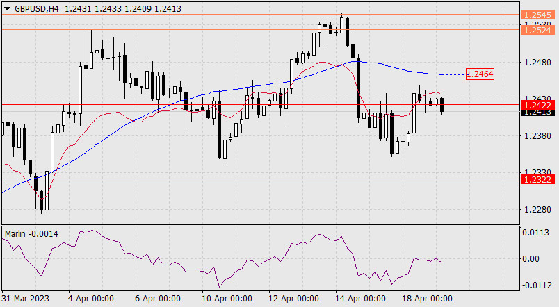 Прогноз по GBP/USD на 19 апреля 2023 годаИнстаФорекс - Instaforex, 2 года назад Вчерашний рост британского фунта на фоне общего небольшого ослабления доллара составил 49 пунктов. Целевой уровень 1.2422 был проколот верхней тенью дневной свечи. Сегодняшний день был открыт ровно на данном уровне. Сигнальная линия осциллятора Марлин приглушённая и направлена вниз – преимущество у понижающегося сценария.