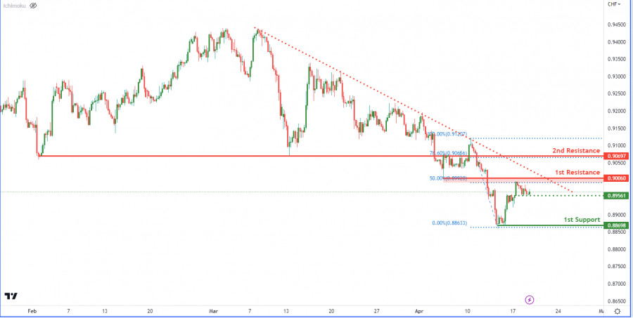 USD/CHF развивает медвежий импульс. Прогноз на 19 апреля 2023 г.ИнстаФорекс - Instaforex, 2 года назад На 4-часовом графике пара USD/CHF развивает медвежий уклон. Наличие основной нисходящей линии тренда указывает на возможное дальнейшее движение вниз. При этом сценарии 1-й уровень сопротивления 0.9006, соответствующий 50% уровню коррекции Фибоначчи, может послужить областью для откатов. Неспособность пробить этот уровень сопротивления может привести к усилению медвежьего импульса. В этом случае цена направится к 1-му уровню поддержки 0.8869, который представляет собой уровень свинг-лоу. В случае пробития 1-го уровня поддержки медвежий импульс может на некоторое время замедлить свой темп на промежуточном уровне поддержки 0.8956. Если цена пробьет и этот уровень, ожидается, что пара снизится ко 2-му уровню поддержки 0.8749, который также представляет собой уровень свинг-лоу. Материал предоставлен компанией InstaForex - www.instaforex.com |
