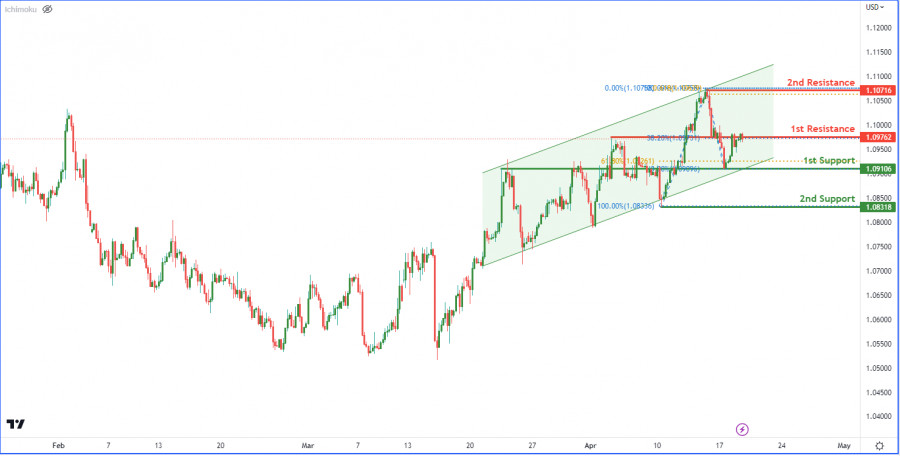 EUR/USD: ожидается дальнейшее развитие восходящей тенденции. Прогноз на 19 апреля 2023 г.ИнстаФорекс - Instaforex, 2 года назад На 4-часовом графике пара EUR/USD в настоящее время торгуется с повышением в рамках восходящего канала, что указывает на возможное продолжение бычьего тренда. В случае сохранения бычьего импульса цена может пробиться выше 1-го уровня сопротивления и направиться ко 2-му уровню сопротивления. Также стоит обратить внимание на наличие двух сильных уровней поддержки. Первый уровень поддержки расположен на отметке 1.0910 и соответствует уровню коррекции Фибоначчи 61.80%. Второй уровень поддержки находится на отметке 1.0831 и представляет собой уровень свинг-лоу. Первый уровень сопротивления на отметке 1.0976 является ключевым уровнем для наблюдения, так как совпадает с уровнем коррекции Фибоначчи 38.20%. Второй уровень сопротивления на отметке 1.1071 представляет собой значительный уровень свинг-хай, который многократно тестировался в прошлом, и, соответственно, является сильной зоной сопротивления для цены. Материал предоставлен компанией InstaForex - www.instaforex.com |