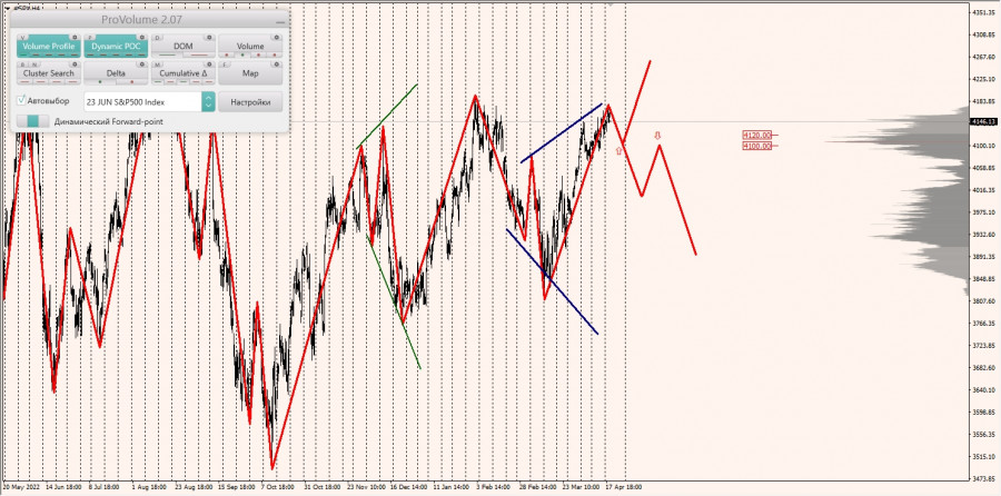 Долгосрочная тенденция: временная неопределенность. Максимальное скопление объемов текущего контракта расположено в диапазоне, по котировкам 4100.00-4120.00. В настоящий момент по SNP500 совершаются инвестиционные операции выше, указывая на силу покупателей.