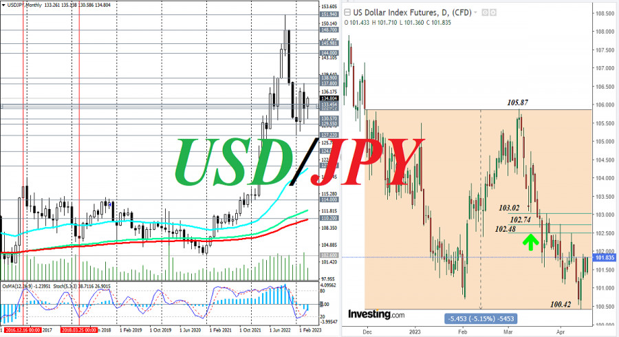 USD/JPY: краткие итоги и ближайшие перспективыИнстаФорекс - Instaforex, 2 года назад В Банке Японии хотят избежать внезапной нормализации монетарной политики, так как это окажет большое влияние на рынки, - заявил на прошлой неделе новый управляющий Банка Японии Казуо Уэда. По его словам, в ЦБ Японии «полностью осознают, что глобальная экономика замедляется, и ожидается дальнейшее замедление», но «в ценах появляются позитивные признаки». На встрече «большой двадцатки» на прошлой неделе он также отметил, что базовая потребительская инфляция в Японии, которая сейчас составляет около 3%, скорее всего, замедлится до уровня ниже 2% во второй половине этого финансового года. При этом, Уэда подтвердил, что «Банк Японии сохранит текущее смягчение денежно-кредитной политики». Опубликованная сегодня утром позитивная макро статистика из Японии также не смогла оказать иене значительной поддержки. Так, согласно данным Министерства экономики, торговли и промышленности Японии, объёмы промышленного производства выросли в отчетном месяце (феврале) на +4,6%, оказавшись лучше прогноза и предыдущего значения +4,5%, а показатель использования производственных мощностей вырос на +3,9% после сокращения на -5,5% в январе, также оказавшись значительно лучше прогноза экономистов о росте на +0,5%. Итак, иена остается под давлением, в том числе после заявлений нового главы Банка Японии Казуо Уэды, в то время как американский доллар сегодня укрепляется. Так, на момент публикации данной статьи фьючерсы индекса доллара DXY торговались вблизи отметки 101.83, примерно на 140 пунктов выше локального 12-месячного минимума 100.42, достигнутого на прошлой неделе. Доллар растет, пытаясь развить восходящую коррекцию после значительного снижения. Однако, как мы видим на графике динамики DXY, ему необходимо преодолеть, как минимум, три локальных уровня сопротивления 102.48, 102.74, 103.02, чтобы направиться к локальному максимуму этого года 105.87. Участники рынка также продолжают оценивать опубликованные на прошлой неделе протоколы мартовского заседания ФРС, который показал, что все руководители американского ЦБ настроены на повышение процентной ставки на 25 б.п., предпочитая продолжать борьбу с высокой инфляцией, несмотря на риски рецессии и кризиса в банковской сфере после краха 2-х американских банков ранее в прошлом месяце. Базовый индекс потребительских цен (Core CPI) вырос в марте на +0,4% (и до +5,6% в годовом выражении), а основной индекс потребительских цен (CPI) замедлился в марте до 5% в годовом исчислении (против прогноза 5,2% и 6,0% в феврале). Однако, инфляция в США все еще почти в 3 раза превышает целевой уровень ФРС в 2%. Недавние ястребиные комментарии представителей руководства ФРС также помогли доллару укрепиться в последние несколько дней. Но вот что будет после майского заседания ФРС, на котором процентная ставка, скорее всего, будет повышена на 0,25%, здесь мнения экономистов разделились. Большинство из них считает, что ФРС затем возьмет паузу в повышениях, чтобы к концу года перейти к смягчению своей кредитно-денежной политики, учитывая риски рецессии в экономике и кризиса в банковской сфере, которые заметно усилились после закрытия двух крупных американских банков, и стремительно растущий госдолг США. Ну а пока что доллар укрепляется, а иена слабеет, что находит отражение в динамике пары USD/JPY: она р
