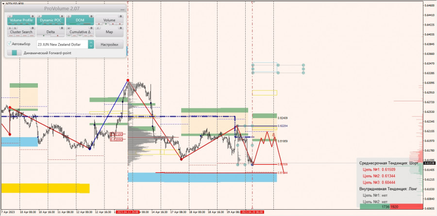 Среднесрочная тенденция: в шорт. Максимальное скопление объемов среднесрочной тенденции расположено в диапазоне по котировкам 0.62000-0.62100. В настоящий момент по паре совершаются инвестиционные операции внутри указанного диапазона, указывая на временную неопределенность.