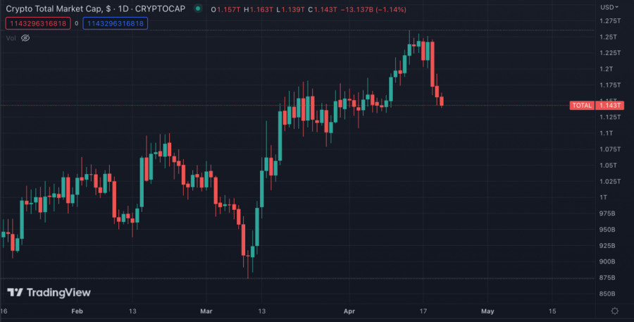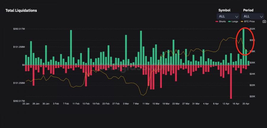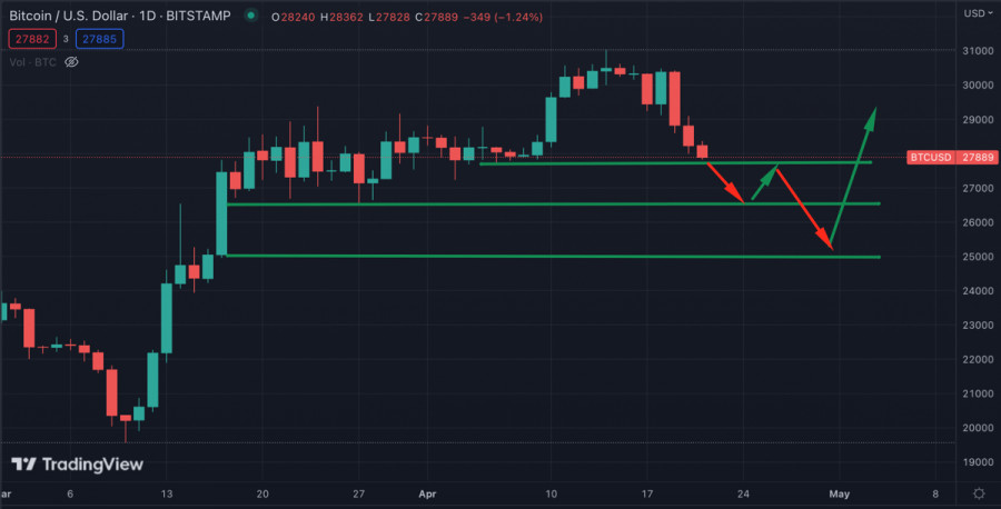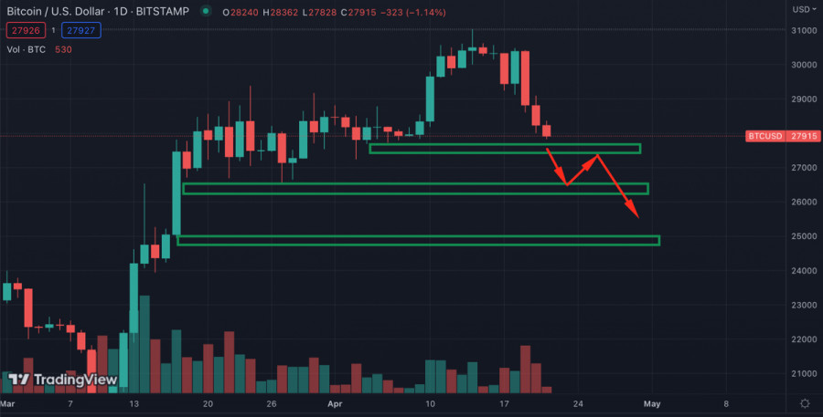 Биткоин совершил медвежий пробой уровня $28k: какие вероятные цели текущей коррекции?ИнстаФорекс - Instaforex, 2 года назад В начале текущей недели Биткоин обновил локальный максимум на отметке $31,1k. Впоследствии цена актива снизилась до локальной зоны поддержки на отметке $30k, что породило слухи о надвигающейся коррекции. Примерно в это же время на дневном таймфрейме MACD сформировал медвежье пересечение. Медвежье давление росло, но покупатели пытались удержать важный уровень $30k. 18 апреля, во вторник, цена BTC поглотила возросшие объемы продавцов и отбила атаку медведей. Однако впоследствии развернуть локальную тенденцию не удалось, и цена совершила первый маневр, указывающий на ложный пробой $30k. Коррекционное движение BTC/USDВпоследствии Биткоин приобрел яркий медвежий окрас и продолжил нисходящее движение до уровня $29k. Здесь проходила локальная зона поддержки и верхняя граница ключевого уровня поддержки, $28,5k-$29k. Этот уровень также оказался пробитым, и цена продолжила падение. По итогам 20 апреля котировки Биткоина упали ниже ключевой зоны поддержки $28,5k. За последние 7 дней BTC потерял 9,5% рыночной капитализации и достиг локального минимума на отметке $27,9k. Объемы ликвидаций длинных позиций за последние сутки составили более $300 миллионов. Несмотря на это, Биткоин сохраняет восходящую структуру и имеет все шансы возобновить восходящее движение. Однако для этого активу необходимо удержать уровень $26,5k, где проходит ключевая зоны накопления. Критическую роль для восходящего тренда BTC также играет уровень $25k, пробой которого приведет к смене среднесрочного тренда. Инвесторы продают из-за потенциального дефолта СШАЗа последние недели возобновились разговоры о предстоящей рецессии американской экономики. Однако при этом в США растет угроза технического дефолта по казначейским обязательствам. В JPMorgan ожидают, что потолок госдолга США может привести к негативным последствиям уже в мае. На фоне этих событий наблюдается растущий интерес к CDS (страховке от дефолта). Также JPMorgan отмечает существенное падение клиентов, готовых купить акции США. Интерес к американским акциям упал до двухлетнего минимума, что вскоре отразится как на фондовом рынке, так и рынке криптовалют. Анализ BTC/USDПо состоянию на 11:00 Биткоин торгуется вблизи уровня $27,9k. Актив совершил медвежий пробой ключевой зоны поддержки. Следующей целью для продавцов станет уровень $26,5k, который BTC удерживает с 17 марта. При пробое данной отметки цена Bitcoin отправится на ретест уровня, где формировался бычий тренд криптовалюты. Пробой уровня $25k станет поворотной точкой в среднесрочной перспективе BTC и усугубит нисходящее движение актива. Однако по состоянию на 21 апреля нет оснований полагать, что ключевой уровень $25k будет пробит, так как текущая коррекция носит скорее оздоровительный характер. До начала локальной коррекции технические метрики Биткоина находились выше уровня 75. Это означает, что актив вплотную приближался к условной точке перекупленности. После пробоя уровня $28k, RSI снизился до уровня 45, а стохастик упал в зону перепроданности, ниже уровня 25. При этом MACD все еще находится довольно высоко и сохраняет прямую нисходящую тенденцию. Это говорит о том, что коррекционное движение актива продолжится. Также не стоит забывать, что ликвидированные $300 миллионов лонгов свидетельствуют