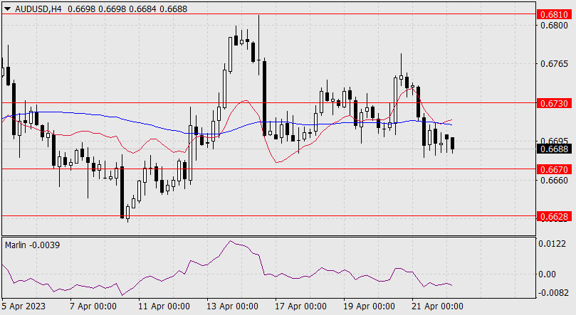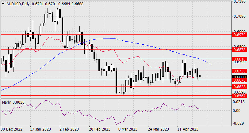 Прогноз по AUD/USD на 24 апреля 2023 годаИнстаФорекс - Instaforex, 2 года назад AUD/USD Сигнальная линия осциллятора Марлин дневного масштаба пока находится в положительной области. Её уход в отрицательную область визуально совпадает с преодолением цены поддержки 0.6670. То есть после преодоления данной поддержки дальнейшее снижение может ускориться.