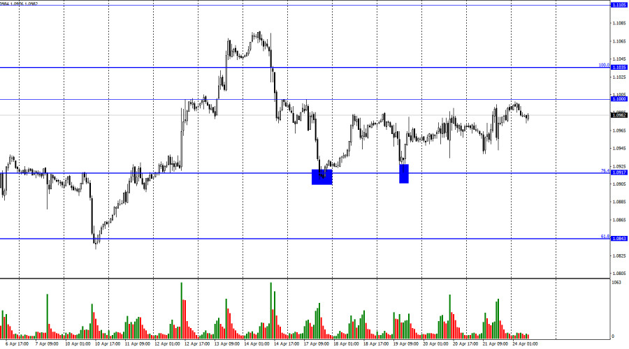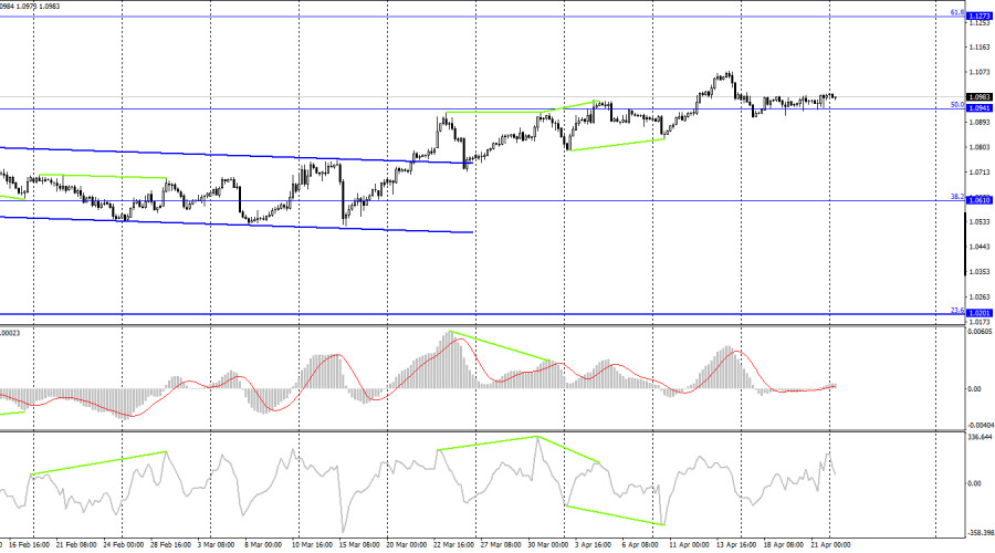 EUR/USD. 24 апреля. Горизонтальное движение во всей своей красеИнстаФорекс - Instaforex, 2 года назад Добрый день, уважаемые трейдеры! Пара EUR/USD в пятницу продолжала горизонтальное движение. Ближе к концу дня котировки пары вышли к уровню 1,1000, но отбоя от него не произошло, закрытия над ним – тоже. Сигналов в течение пятницы не было ни одного, а активность трейдеров находилась на ноле. Закрепление курса пары над уровнем 1,1000 повысит вероятность продолжения роста в направлении уровней 1,1035 и 1,1105. Отбой от 1,1000 сработает в пользу валюты США и падения к уровню 1,0917. В пятницу американские данные могли порадовать трейдеров, но доллар США лишь на очень короткий период времени ощутил состояние эйфории. Когда стало известно о росте индексов деловой активности в секторах производства, услуг и составного, американская валюта резко перешла в рост, но запал трейдеров-медведей очень быстро закончился ввиду не самой высокой степени важности опубликованных данных. А до конца дня европейская валюта успела еще и вырасти сильнее, чем в первой половине дня до выхода американской статистики. Таким образом, доллар США не сумел извлечь никакой пользы из данных о деловой активности. На этой неделе интересные отчеты начнут выходить лишь в среду. Понедельник и вторник можно смело относить к выходным дням, так как календари экономических событий абсолютно пусты. Так как последние 4 дня пара провела в горизонтальном движении, то нет сомнения, что первые два дня новой недели будет наблюдаться похожая картина. Для нас это не самый благоприятный вариант развития событий, но рынок в последнее время отчетливо демонстрирует свое желание дождаться важных событий и отчетов, чтобы определиться с направлением движения. Инициативу на рынке по-прежнему удерживают быки, но они сомневаются в дальнейших покупках евровалюты, так как ЕЦБ может в мае повысить процентную ставку только на 0,25%, что будет означать отказ от агрессивного подхода борьбы с высокой инфляцией. На 4-часовом графике пара выполнила закрепление над боковым коридором, что позволяет рассчитывать на продолжение роста в направлении уровня коррекции 61,8% - 1,1273. Над уровнем коррекции 50,0% - 1,0941 также удалось выполнить закрепление, что повышает шансы на дальнейший рост. «Бычья» дивергенция у индикатора CCI аналогично сработала в пользу евро. Новых назревающих дивергенций пока не наблюдается. Отчет Commitments of Traders (COT):