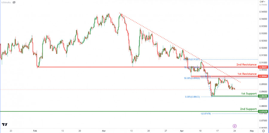 USD/CHF торгуется под давлением медведей. Прогноз на 24 апреля 2023ИнстаФорекс - Instaforex, 2 года назад На 4-часовом графике пара USD/CHF в настоящее время торгуется с понижением. При этом цена находится ниже значимой нисходящей линии тренда, что указывает на потенциальное усиление медвежьего импульса. Ожидается, что цена может снизиться к 1-му уровню поддержки 0.8869, который является уровнем свинг-лоу и ключевой областью покупательского интереса. Кроме того, этот уровень поддержки совпадает с 50% уровнем коррекции Фибоначчи, который имеет большое значение в техническом анализе. Что касается уровней сопротивления, 1-й уровень сопротивления 0.9006 представляет собой уровень свинг-хай и ранее выступал как значительная область интереса к продажам. Второй уровень сопротивления находится на отметке 0.9069 и соответствует уровню коррекции Фибоначчи 78.60%. Таким образом, этот уровень сопротивления потенциально может служить препятствием для восходящего движения цены. Материал предоставлен компанией InstaForex - www.instaforex.com |