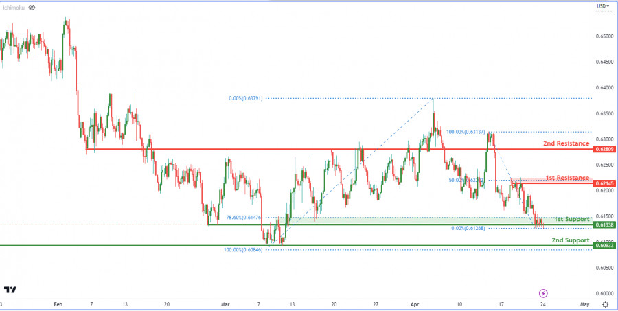 NZD/USD: возможен бычий отскок. Прогноз на 24 апреля 2023ИнстаФорекс - Instaforex, 2 года назад На 4-часовом графике пара NZD/USD в настоящее время торгуется под контролем быков. Ожидается, что цена может продолжить восходящее движение, отскочив от 1-го уровня поддержки 0.6133 и направившись к 1-му уровню сопротивления 0.6214. Первый уровень поддержки на отметке 0.6133 считается сильным уровнем, так как совпадает с уровнем коррекции Фибоначчи 78.60%. Ранее этот уровень выступал в качестве области покупательского интереса. Второй уровень поддержки расположен на отметке 0.6093 и представляет собой уровень свинг-лоу. Этот уровень также ранее привлекал интерес покупателей и сейчас может выступить в качестве дополнительного уровня поддержки в случае дальнейшего падения цены. Что касается уровней сопротивления, то 1-й уровень сопротивления расположен на отметке 0.6214, которая является уровнем свинг-хай и совпадает с 50% уровнем коррекции Фибоначчи. Этот уровень ранее выступал в качестве значительной области интереса к продажам, поэтому прорыв выше этой отметки может вызвать усиление бычьего импульса. Второй уровень сопротивления расположен на отметке 0.6280 и также имеет важное значение, поскольку может послужить барьером для восходящего движения цены. Материал предоставлен компанией InstaForex - www.instaforex.com |