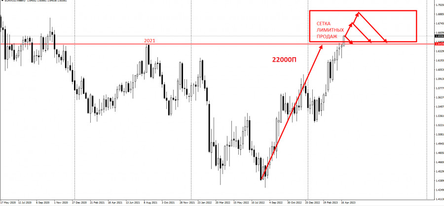 EURAUD - старт сетки лимитных продаж.ИнстаФорекс - Instaforex, 2 года назад Добрый день уважаемые трейдеры! Представляю вашему вниманию торговую идею по EURAUD. Итак, со второй половины прошлого года инструмент с небольшими откатами прошёл 22000 п и на данный момент переписал вершину 22 года, что даёт отличную. возможность набрать сетку лимитных продаж для шортовой коррекции по следующей схеме: Начиная с текущих цен и выше возможна установка сетки лимитных продаж с шагом 1000 п по 5-знаку. |