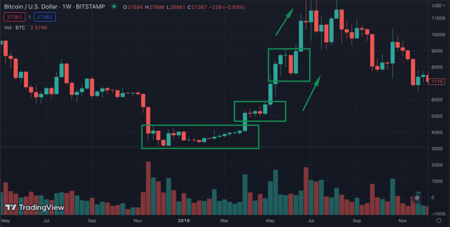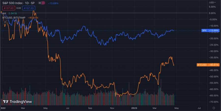 Биткоин удерживает $27k: коррекция актива выдохлась?ИнстаФорекс - Instaforex, 2 года назад За последние несколько дней Биткоин окончательно перешел в фазу коррекционного движения. Неудачный пробой $31k и последующее снижение за уровень $30k спровоцировали довольно быстрое снижение цены до отметки $27k. Однако уровень $27k оказался прочной зоной поддержки, где ранней весной быки накопили большие объемы BTC. Как следствие криптовалюте удалось отстоять данный рубеж и локально восстановиться выше $27,5k. Последние 4 дня цена BTC торгуется выше данной области, что может указывать на снижение медвежьей активности. Рынок акций помогает?Рынок акций ежедневно производит контраверсионные прогнозы и заявления. С одной стороны инвесторы ожидают мощного падения основного индекса SPX на 400 пунктов. В то же время более 75% компаний, которые уже отчитались за первый квартал 2023, показали обнадеживающие показатели прибыли. При этом в Wells Fargo уверены, что во втором полугодии 2023 года экономику США ожидает рецессия. Отмечается также, что ФРС не планирует снижать уровень ключевой ставки до начала 2024 года, что может усугубить проблемы с ликвидностью. В краткосрочной перспективе ситуация также остается негативной, так как Fedwatch сообщает, что рынки закладывают 89%-ю вероятность повышения ключевой ставки в мае. Инвесторы полагают, что показатель будет поднят еще на 0,25%. Несмотря на трехмесячное "сгущение туч" над фондовым рынком, SPX уверенно удерживает планку в $4000 и продолжает рост до показателя в $4100. Корреляция между BTC и SPX сохраняется, а потому нельзя отрицать важность фондового индекса в устойчивости криптовалюты. Инвестиционный климат вокруг крипто рынкаВпервые за 4 недели CoinShares фиксирует отток средств из крипто продуктов в размере $30 миллионов. При этом за приток средств за последние 4 недели составил более $300 миллионов, и за этот период BTC показал существенный прирост и обновил максимум на $32k. Glassnode отмечает медвежью тенденцию на рынке BTC. Инвесторы продолжают массово заводить криптовалюту на биржи. Обычно этот процесс предшествует фиксации прибыли и последующему снижению котировок криптовалюты. Аналитики Santiment также указывают на возобновление активных действий краткосрочными трейдерами, которые за последние две недели продают BTC в убыток в три раза чаще, чем в профит. Это также свидетельство локальной перегретости рынка и необходимости очищения от манипулятивного капитала. Анализ BTC/USDРассматривая BTC хотелось бы остановиться на уровне $27,4k, где по итогам вчерашнего торгового дня, 24 апреля, была сформирована неуверенная свеча "доджи". Вполне вероятно, что при текущих рыночных условиях формирование такого паттерна указывает на паузу или истощение текущего нисходящего движения. У Биткоина есть шансы совершить локальный разворот, если активу удастся завершить текущий торговый день выше уровня $28k. При этом на 1D таймфрейме BTC/USD выглядит по-медвежьи, и все основные метрики указывают на дальнейшее снижение. При этом схожесть текущей ситуации с паттерном начала 2019 года указывает на скорое возобновление восходящего движения криптовалюты. BTC полностью повторяет период формирования локального дна и накопления, после чего идет локальный спад и дальнейшее бычье движение. ИтогиФундаментально ситуация остается без изменений до тех пор, пока BTC не совершит медвежий пробо