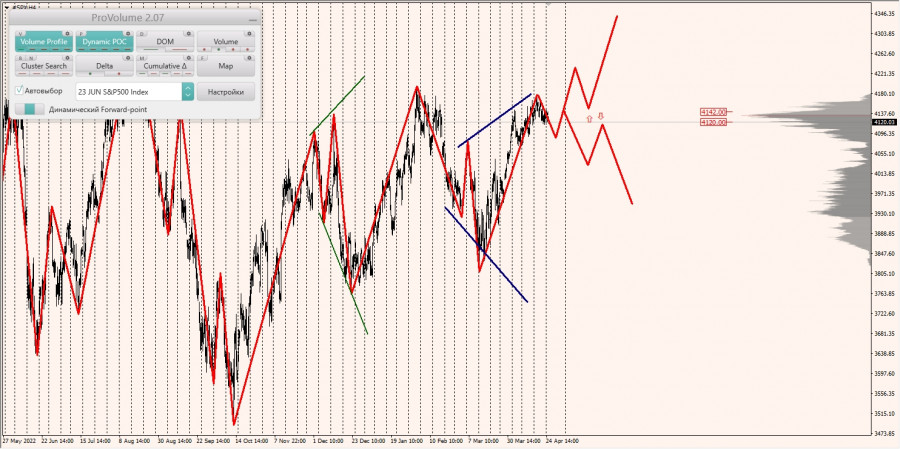 Альтернативный сценарий: при закреплении котировок индекса SNP500 ниже зоны 1/2 (4056.20) при откатах искать продажи по паттерну в новом диапазоне выгодных цен с целями: обновление минимумов и тестирование верхней границы НКЗ (3955.40).