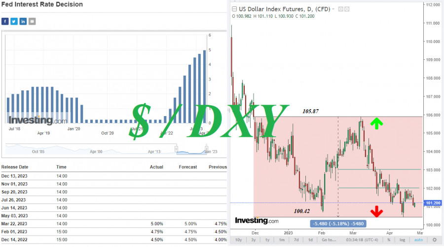 Доллар: краткие итоги и ближайшие перспективыИнстаФорекс - Instaforex, 2 года назад Попыткам роста, предпринятым долларом на прошлой неделе, в понедельник был нанесён ощутимый удар. Индекс доллара DXY, укреплявшийся в ходе вчерашней азиатской торговой сессии, к концу вчерашнего торгового дня вновь довольно резко снизился, протестировав отметку 101.00. В ходе сегодняшней азиатской торговой сессии индекс доллара DXY также снижался, обновив локальный минимум с 17 апреля на отметке 100.93. Вероятно, что психологическая отметка 100.00 также вскоре будет пробита и индекс доллара направится в сторону минимумов 2020 года, расположенных вблизи отметки 89.00. Все меньше дней остаётся до майского заседания ФРС. Как следует из протоколов мартовского заседания, часть руководителей американского ЦБ считает, что необходимо приостановить цикл ужесточения монетарной политики из-за рисков усиления давления на банковский сектор и экономику в целом, что в конце концов приведет как минимум к рецессии. Хотя о масштабном кризисе или крахе экономики пока речь не идет, рецессия опасна тем, что может перерасти в стагнацию, грозящую массовыми увольнениями и сокращением уровня жизни населения, что может в конце концов привести к глобальным политическим изменениям, в том числе в государственном устройстве, отмечали мы в одном из наших предыдущих обзоров. Участники рынка оценивают поступающую из США макро экономическую статистику, пытаясь спрогнозировать как вероятность наступления рецессии в американской экономике, так и действия ФРС в текущих условиях. Большинство экономистов считает, что руководители американского ЦБ повысят процентную ставку на 25 б.п. на заседании 2 и 3 мая, а затем возьмут паузу в повышениях, чтобы к концу года перейти к смягчению кредитно-денежной политики. Также перед властями США стоит проблема огромнейшего госдолга (более 31 трлн долларов), и если не принять меры по повышению или отмене лимита госдолга, то уже летом этого года правительство не сможет исполнить свои финансовые обязательства, что будет означать дефолт американской экономики, говорится в недавнем отчете бюджетного управления Конгресса. Также, чтобы хоть частично покрыть дефицит бюджета США (в этом году он составит, по подсчетам экономистов, $1,4 трлн), не исключено, что ФРС увеличит мощность печатного станка, что, в свою очередь, ускорит инфляцию, и так уже в разы превышающую целевой уровень ФРС в 2%, и удешевление доллара. Таким образом, перед ФРС вновь стоит трудно выполнимая задача – снизить инфляцию, не навредив при этом экономике. На этой неделе участникам рынка будет предоставлена возможность вновь оценить перспективы американской экономики, монетарной политики ФРС и доллара: в среду (в 12:30 GMT) будут опубликованы свежие данные по заказам на товары длительного пользования, подразумевающие крупные инвестиции в их производство (здесь ожидается рост показателей), а четверг (также в 12:30 GMT) – предварительные данные по ВВП и индексу цен PCE (это основной показатель инфляции, который чиновники ФРС используют в качестве основного индикатора инфляции) за 1-й квартал 2023 года. Экономисты прогнозируют замедление с 2,6% до 2,0% (в годовом выражении) американской экономики в 1-м квартале и ускорение роста индекса цен PCE (до +4,8% с 4,4% в предыдущем квартале). Как отреагирует рынок на эти данные в свет