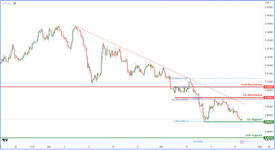 USD/CHF: ожидается усиление медвежьего импульса. Прогноз на 25 апреля 2023ИнстаФорекс - Instaforex, 2 года назад На 4-часовом графике пара USD/CHF в настоящее время развивает медвежий импульс. Ожидается, что цена может продолжить падение к 1-му уровню поддержки. Первый уровень сопротивления находится на отметке 0.9006 и может оказать сопротивление цене в случае ее роста. Этот уровень совпадает с 50% уровнем коррекции Фибоначчи. Если цена преодолеет 1-й уровень сопротивления, она направится к следующему уровню сопротивления 0.9070. Этот уровень совпадает с 78.60% уровнем коррекции Фибоначчи, что делает его сильным уровнем сопротивления. С другой стороны, если цена упадет, она столкнется с 1-м уровнем поддержки 0.8860. Этот уровень представляет собой уровень свинг-лоу и может обеспечить поддержку цене в случае ее падения. Следующий уровень поддержки расположен на отметке 0.8764 и также может оказать дополнительную поддержку цене в случае усиления медвежьего импульса. Материал предоставлен компанией InstaForex - www.instaforex.com |