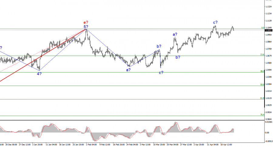 Анализ EUR/USD. 25 апреля. Филип Лейн поддерживает повышение ставки в маеИнстаФорекс - Instaforex, 2 года назад Волновая разметка 4-часового графика для инструмента Евро/Доллар продолжает запутываться из-за последних восходящих волн, но в целом не меняется в последние дни и недели. Эти волны вполне могут быть самостоятельным повышательным участком тренда (так как последний нисходящий можно считать трех волновым и завершенным), и он может быть также уже завершен, если примет трехволновой вид. Таким образом, по евровалюте волновая картина может получиться очень сложной, а работать по ней уже сейчас очень тяжело. На текущих позициях построение повышательного набора волн может завершиться, так как пик третьей волны зашел за пик первой. То же самое мы видели и в последней нисходящей формации (минимальное обновление лоу и завершение участка). Вместе с тем есть и другие варианты волновой разметки. Например, полноценная пятиволновая (но тоже коррекционная) структура. Я считаю, что сейчас целесообразно отталкиваться от сценария с понижением инструмента, потому что восходящая трехволновка выглядит вполне укомплектованно и завершенно. Следовательно, в данное время может начаться построение новой нисходящей трехволновки, а неудачная попытка прорыва отметки 1,1030 указывает на готовность рынка к продажам. Спрос на евровалюту уже падает, хотя новостной фон не изменилсяИнструмент Евро/Доллар в понедельник повысился на 60 базовых пунктов, а сегодня снизился на 40. Напомню, что ключевым событием вчерашнего дня можно считать выступление Пьера Вунша, президента центрального банка Бельгии, который заявил, что ставки по депозитам и кредитам могут вырасти сильнее, чем все того ждут. Он открыто заявил, что цели по инфляции и заработным платам не достигнуты, поэтому регулятор будет продолжать ужесточение денежно-кредитной политики, пока эти два показателя не начнут замедляться. Риторика однозначно «ястребиная». Сегодня главный экономист ЕЦБ Филип Лейн заявил, что ставку по итогам майского заседания, которое состоится уже на следующей неделе, необходимо снова повысить. Рынок не сомневался в том, что ЕЦБ примет такое решение, вопрос лишь в том, насколько вырастет ставка. В данное время вероятность повышения на 25 базисных пунктов составляет около 65%, а на 50 базисных пунктов – 35%. Заявления, сделанные Лейном, тоже можно считать «ястребиными» или хотя бы нейтральными, но уж точно не «голубиными». Однако сегодня спрос на европейскую валюту уже снижается. Исходя из этого, я считаю, что рынок показывает свою неготовность продолжать наращивать покупки, что вновь повышает шансы на построение новой нисходящей трехволновки. Вчерашнее повышение выглядит случайным, так как новостной фон вчера и сегодня был практически одинаковым. Состоялось два выступления членов ЕЦБ, каждый из которых заявил о необходимости продолжать повышать ставки. Но вчера евро вырос, сегодня упал. Я по-прежнему считаю, что сценарий с построением нового понижательного участка тренда наиболее логичен и справедлив в данное время. Общие выводыИсходя из проведенного анализа, я делаю вывод, что построение повышательного участка тренда завершено. Поэтому сейчас можно посоветовать продажи, инструмент имеет большой простор для снижения. Я думаю, что цель 1,0600 можно считать вполне реальной. С этой це