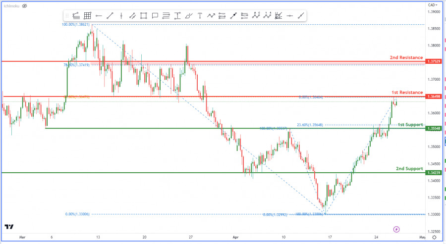 USD/CAD: ожидается дальнейшее развитие восходящей тенденции. Прогноз на 26 апреля 2023 г.ИнстаФорекс - Instaforex, 2 года назад На 4-часовом графике пара USD/CAD в настоящее время развивает бычий импульс. Ожидается, что цена может продолжить рост к 1-му уровню сопротивления 1.36498, который может оказать потенциальное сопротивление цене в случае ее роста. Если цена прорвется выше 1-го уровня сопротивления, она направится к следующему уровню сопротивления, расположенному на отметке 1.37529. Этот уровень совпадает с 78.60% уровнем коррекции Фибоначчи, что делает его сильным уровнем потенциального сопротивления. С другой стороны, если цена упадет, то 1-й уровень поддержки находится на отметке 1.35548 и соответствует 23.60% уровню коррекции Фибоначчи, что может обеспечить потенциальную поддержку цене в случае ее падения. Следующий уровень поддержки расположен на отметке 1.34239, которая представляет собой уровень свинг-лоу и может оказать дополнительную поддержку цене в случае ее дальнейшего снижения. Материал предоставлен компанией InstaForex - www.instaforex.com |