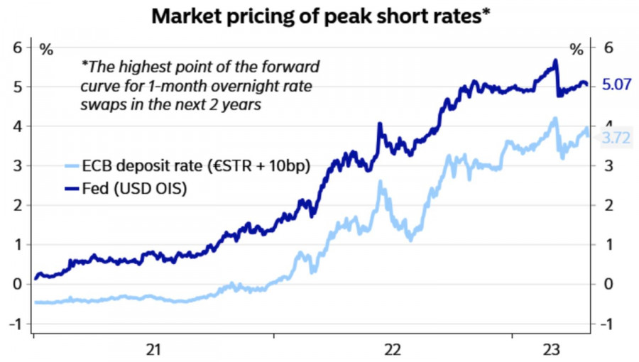 Евро играет на нервахИнстаФорекс - Instaforex, 2 года назад Рынки как люди: если не знают, что делать – нервничают. Начинают бросаться из крайности в крайности в поисках выхода. Давненько не приходилось видеть такого частокола в паре EURUSD. Она то растет, то еще быстрее падает, то вновь растет, полностью отыгрывая вчерашние потери. Когда на носу заседания ФРС и ЕЦБ, решения на которых будут приниматься в зависимости от данных, и целая гора этих данных, волей-неволей начнешь нервничать. Формально главным драйвером ралли евро стала позитивная статистика по потребительскому климату Германии от GfK, который превзошел прогнозы экспертов Bloomberg, и «ястребиная» риторика членов Управляющего совета. Пьер Вунш, Изабель Шнабель и Филип Лейн были настолько убедительны, что срочный рынок повысил предполагаемый пик ставки по депозитам до 4%. Он верит в продолжение монетарной рестрикции ЕЦБ даже в том случае, если апрельская статистика покажет достижение пика базовой инфляцией. В конечном итоге максимум по Core CPI – это еще не конец пути Европейского центробанка. Нужно увидеть уверенное движение инфляции к таргету в 2%. Динамика рыночных ожиданий по потолку ставок ФРС и ЕЦБ В Штатах же ничего не меняется. Шансы па повышение ставки по федеральным фондам в мае на 25 б.п. пляшут от 77% до 91% и обратно. В то же время предполагаемый пик держится на уровне 5,25%, что говорит о скором окончании цикла ужесточения денежно-кредитной политики ФРС. Тем хуже для доллара США. Индекс USD неожиданно поучил заряд бодрости из-за выхода в свет разочаровывающей статистики по американскому потребительскому доверию и слабой корпоративной отчетности First Republic. Инвесторы как будто вспомнили, что доллар – это валюта-убежище, он в теории должен расти, когда падают фондовые индексы, а от экономики поступают плохие новости. Пусть это и экономика США. Вспомнили и тут же усомнились. Все-таки текущая ситуация уникальна, и если раньше EURUSD росла на ожиданиях, что Штаты станут единственной крупной экономикой, которая окунется в рецессию, то почему все должно измениться за один день? Евро быстро отыграл потери, однако не факт, что он не упадет в ответ на релизы данных по американским ВВП и инфляции. Позитив позволит говорить об устойчивости экономики США, и если прибавить к этому сохранение цен на повышенных уровнях, то почему бы ФРС не поднять ставку по федеральным фондам до 5,5%? Или до 5,75%? Все действительно будет зависеть от данных, и кто знает, какими они окажутся. Технически текущая консолидация EURUSD – нечто из ряда вон выходящее. Еще вчера было ощущение, что отыграет разворотный паттерн 1-2-3, однако «медведи» не смогли опустить котировки ниже справедливой стоимости на 1,097, и на этом их атака закончилась. Почуяв запах крови, покупатели тут же взяли быка за рога и настроились на обновление годовых максимумов. На мой взгляд, в текущей ситуации лучше либо оставаться вне рынка, либо использовать уровень 1,1 как своеобразную красную линию. Выше нее покупать EURUSD, ниже – продавать. Материал предоставлен компанией InstaForex - www.instaforex.com |