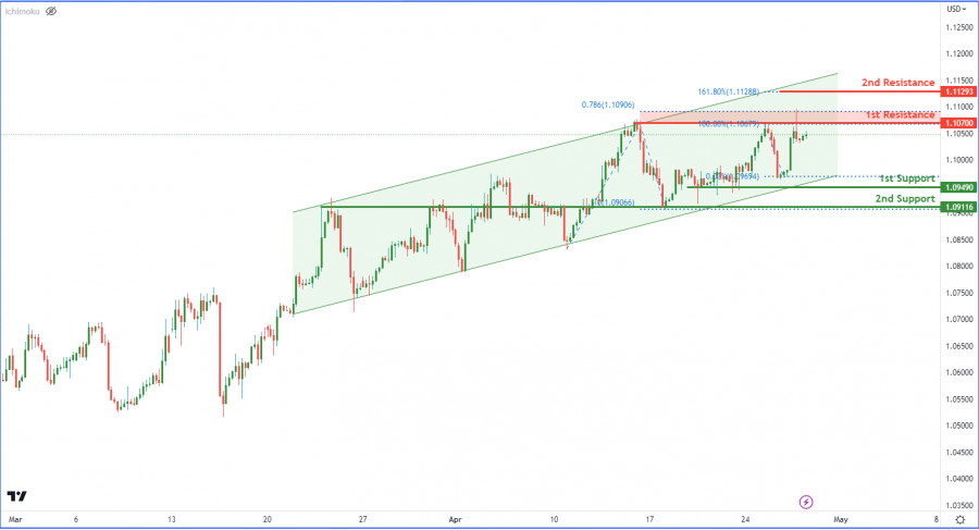 EUR/USD: ожидается усиление бычьего импульса. Прогноз на 27 апреля 2023ИнстаФорекс - Instaforex, 2 года назад На 4-часовом графике пара EUR/USD развивает бычий импульс. В настоящее время цена торгуется в рамках восходящего канала. Ожидается, что цена продолжит расти. Существует вероятность бычьего пробоя 1-го уровня сопротивления, что приведет к скачку цены ко 2-му уровню сопротивления. Первый уровень поддержки расположен на 1.0949 и представляет собой уровень свинг-лоу. Второй уровень поддержки находится на отметке 1.0911. С другой стороны, 1-й уровень сопротивления, расположенный на 1.1070, представляет собой уровень свинг-хай и соответствует проекции Фибоначчи 78.60%. Второй уровень сопротивления находится на отметке 1.1129 и совпадает с уровнем расширения Фибоначчи 161.80%. Материал предоставлен компанией InstaForex - www.instaforex.com |