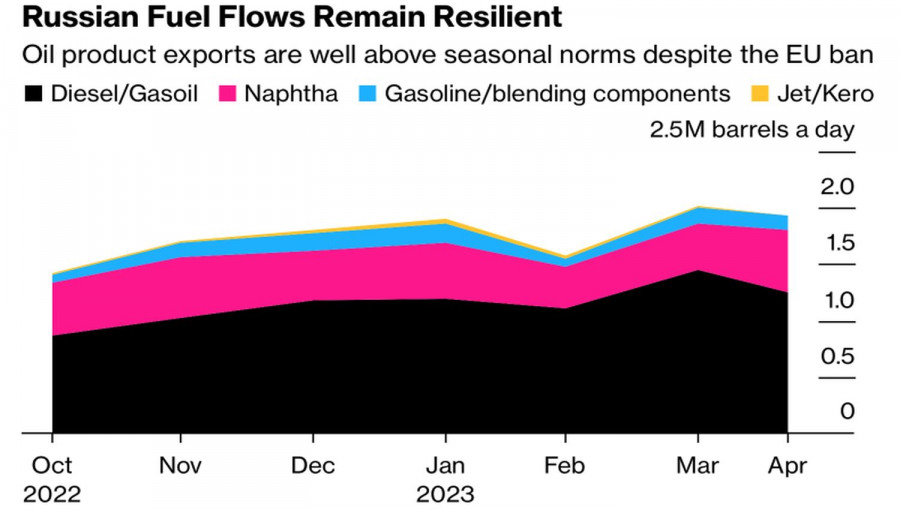 Рублю уже ничем не поможешь?ИнстаФорекс - Instaforex, 2 года назад Когда большой поток хороших новостей не приводит к укреплению валюты, нужно задуматься, не слишком ли высок ее курс. Позитив от промышленного производства, повышение котировок Urals, переориентация потоков нефти и нефтепродуктов с ростом их объемов и идущая полным ходом дедолларизация, казалось бы, должны были спровоцировать коррекцию USDRUB. Тем более что опасения по поводу банковского кризиса и рецессии в Штатах оказывают давление на американскую валюту. Увы, но лучшее, что удалось рублю, это стабилизироваться. Что будет, когда хорошие известия уступят место плохим? В марте промышленное производство в России расширилось на 1,2% в годовом исчислении, что существенно превзошло прогноз экспертов Bloomberg о его сокращении на 1,4%. Отличная новость для экономики, хотя все прекрасно понимают, за счет чего это произошло. Рост производства готовых металлических изделий, куда включаются оружие и боеприпасы, на 30%, и другого транспорта, к которому относятся боевые машины, самолеты и корабли, на 10%, обеспечили позитивную динамику показателя. Несмотря на введение западных санкций в отношении экспорта нефтепродуктов Россией, его объемы продолжают увеличиваться и достигли максимальной с 2016 отметки 1,9 млн б/с. Были сомнения, что Москва не найдет новых покупателей, так как, в отличие от нефти, дизельное топливо и другие чистые нефтепродукты не нужны ни Китаю, ни Индии. Но спрос со стороны Турции, Марокко, Туниса, Ливии и Бразилии позволил говорить об эффективной переориентации потоков. Динамика поставок российских нефтепродуктов Ничуть не хуже обстоят дела в сфере экспорта российской нефти морскими путями. За неделю к 21 апреля объемы не изменились после восстановления пятидневкой ранее и составили 3,4 млн б/с. Высокий спрос со стороны Турции, Индии и Китая привел к тому, что средний за 4 недели показатель достиг нового максимума. Если прибавить к этому рост котировок USDRUB основного российского сорта Urals с $35 за баррель в январе до текущих $55, можно предположить, что самое страшное для счета текущих операций и бюджета РФ осталось позади. В теории это должно оказывать поддержку «медведям» по USDRUB. В условиях широких западных санкций и ухода иностранных инвесторов с российского рынка курс рубля определяется потоками торгового характера. Имеющие здесь место позитивные сдвиги могли бы спровоцировать откат, но этого не произошло. Следовательно, рынок по-прежнему считает, что пара недооценена. Не помогает продавцам USDRUB и сообщение об увеличение доли рубля и юаня в расчетах по экспорту энергоносителей. По данным ЦБ РФ, удельный вес китайской валюты при оплате импортных контрактов подскочил в 2022 с 4% до 23%. Технически на дневном графике продолжается восходящее движение USDRUB. Целевой ориентир на 224% по паттерну AB=CD сохраняет свою актуальность. Он соответствует отметке 86. Рекомендация остается прежней - используем любую возможность для покупки доллара США против рубля. Материал предоставлен компанией InstaForex - www.instaforex.com |